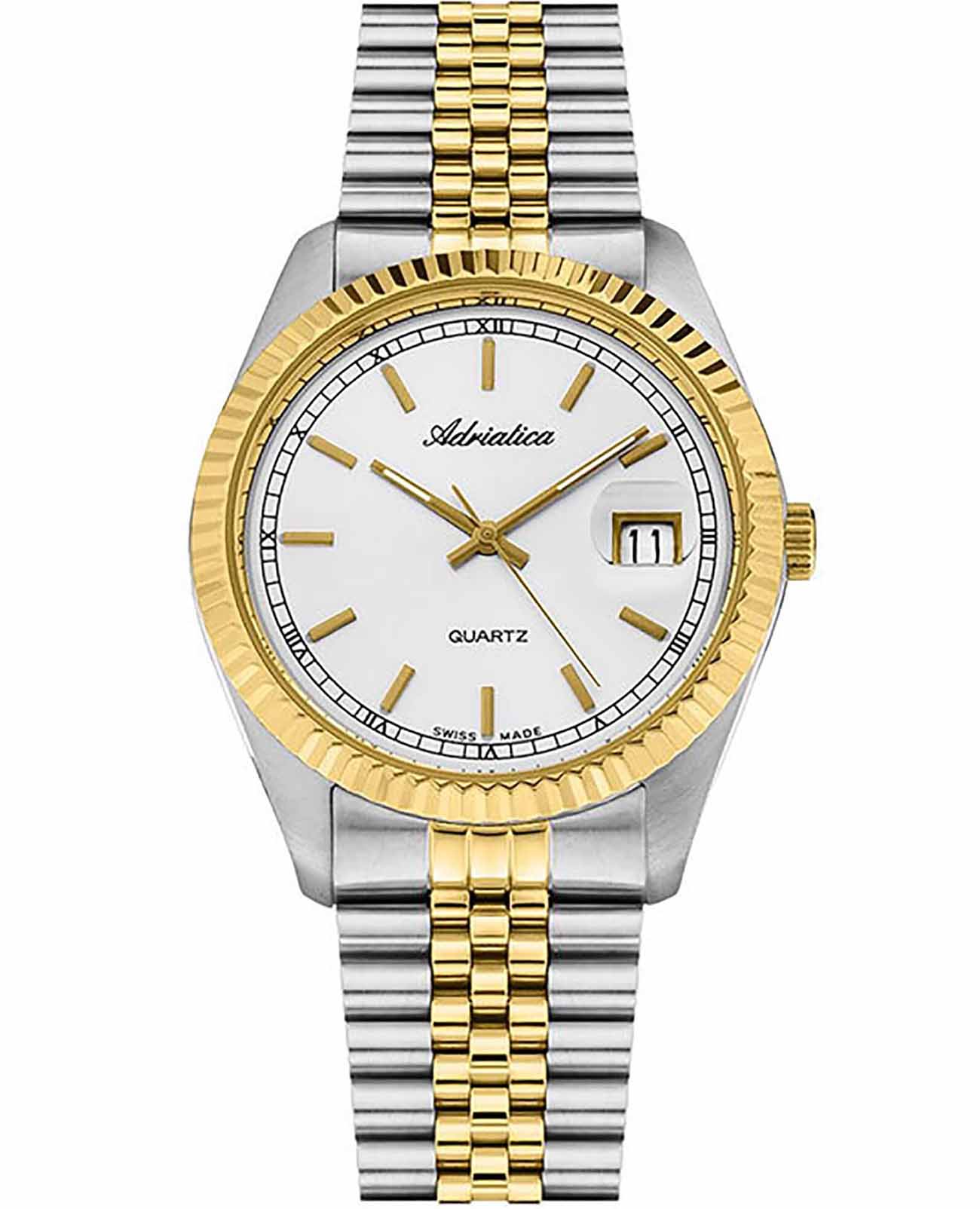 Часы Adriatica A1090.2113Q воплощают в себе классический стиль и надежность, идеально подходящие для современных мужчин. Их белый циферблат, защищенный минеральным стекломМинеральное стеклоМинеральное стекло представляет собой искусственно выращенный минерал кварца. Такое стекло отличается особой устойчивостью к повреждениям и царапинам. Уступает по некоторым качествам сапфировому стеклу., заключен в корпус из прочной нержавеющей стали, а их безельБезельВнешний ободок, закрепляющий стекло. В спортивных часах так называется поворотное кольцо с делениями на циферблате, выполняет роль таймера – замеряет отрезки времени на шкале. Неподвижный безель – элемент декора. Однонаправленно вращающийся безель на дайверских часах позволяет фиксировать моменты погружения и выныривания на поверхность. золотистого цвета с PVDPVDУльтратонкое покрытие наносится в технике вакуумного напыления, сочетает в себе нитрид титана особой прочности со слоем золота или оксида хрома. Несёт в себе декоративную или защитную функцию. покрытием. Надежный кварцевый механизм с калибром RONDA 515 обеспечивает точность, а водозащита уровня WR 50 (5 ATM) делает их устойчивыми к воздействию воды. Стальной браслет с частичным PVDPVDУльтратонкое покрытие наносится в технике вакуумного напыления, сочетает в себе нитрид титана особой прочности со слоем золота или оксида хрома. Несёт в себе декоративную или защитную функцию. покрытием и раскладной застёжкойРаскладная застёжкаТакой тип застёжки используется только на браслетах из металла. Она никогда не раскрывается полностью, происходит разделение на 2 и более частей. Раскладывающая застёжка снизит вероятность потери часов к минимуму. подчеркивает элегантный стиль и комфортно сидит на запястье. Часы оснащены функцией отображения даты в окошке в положении 3 часа, что добавляет практичности в повседневной жизни. Люминесцентное покрытиеЛюминесцентное покрытиеПозволяет считывать показания времени в темноте. Производители наносят на стрелки, часовые индексы, безель или поверхность циферблата светонакопительный состав, дающий холодное свечение. на стрелках и метках обеспечивает отличную видимость в темноте.