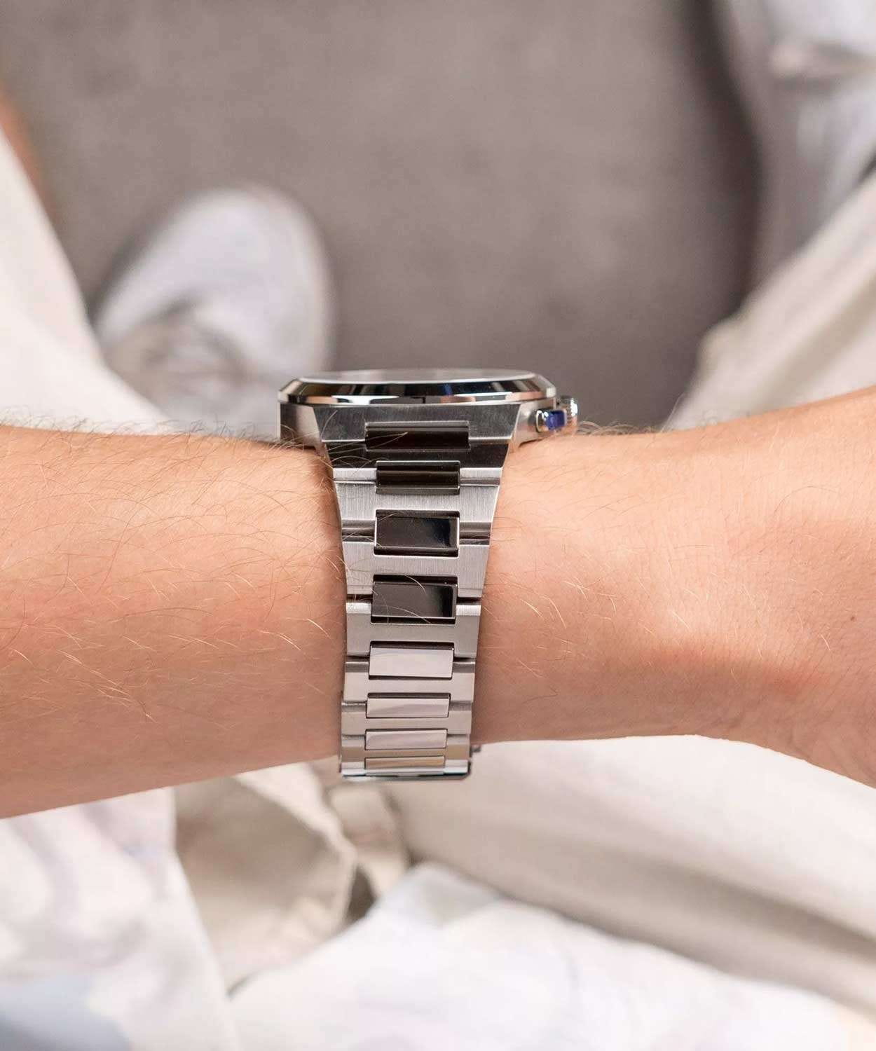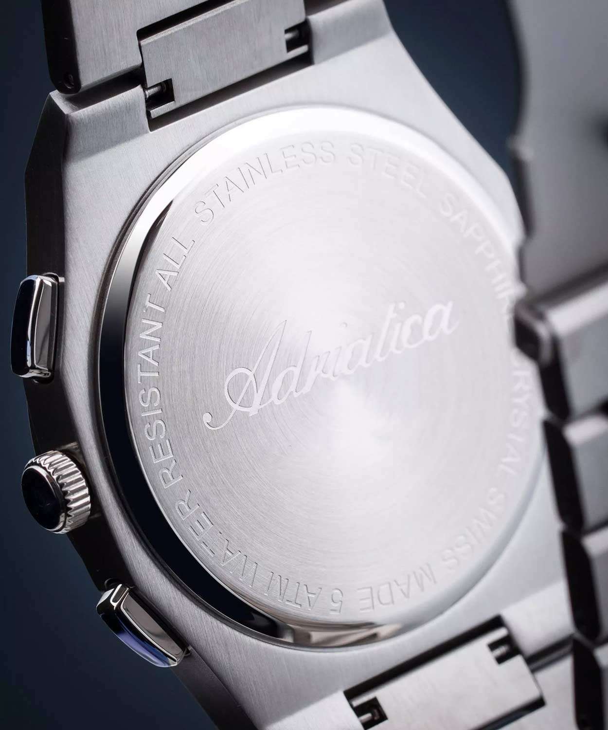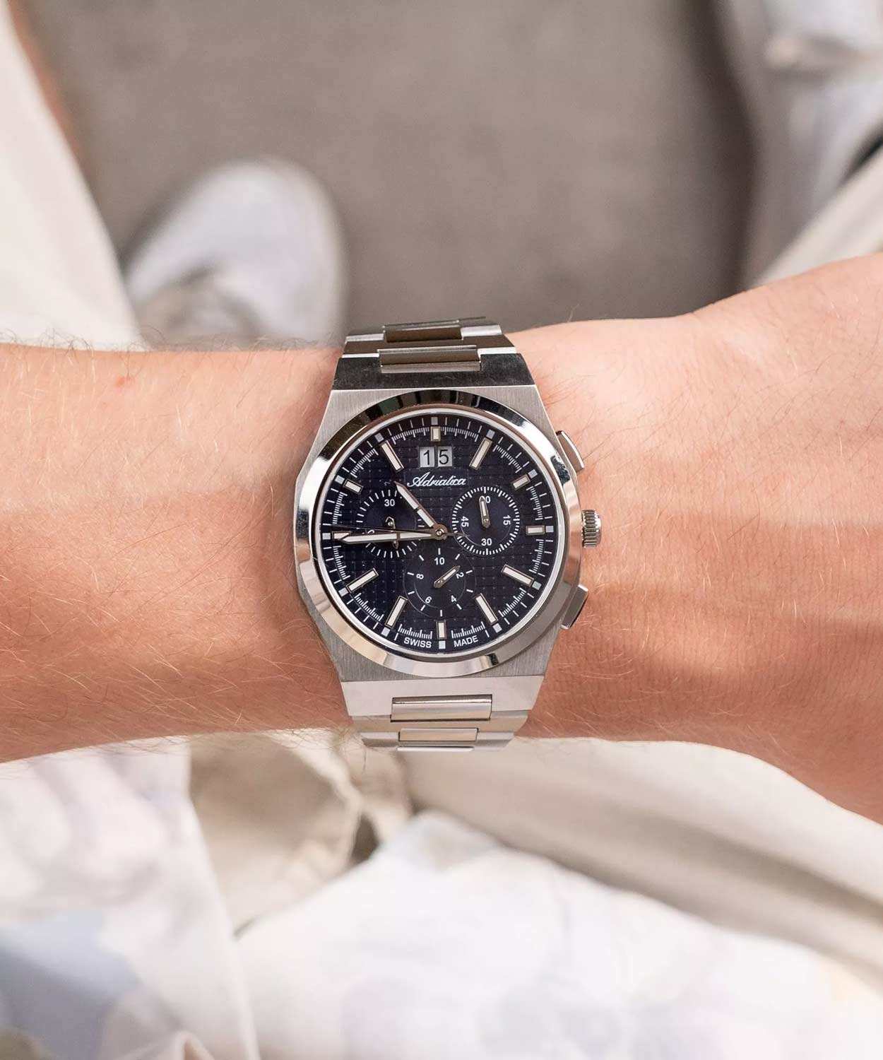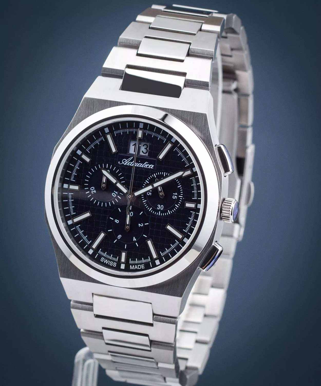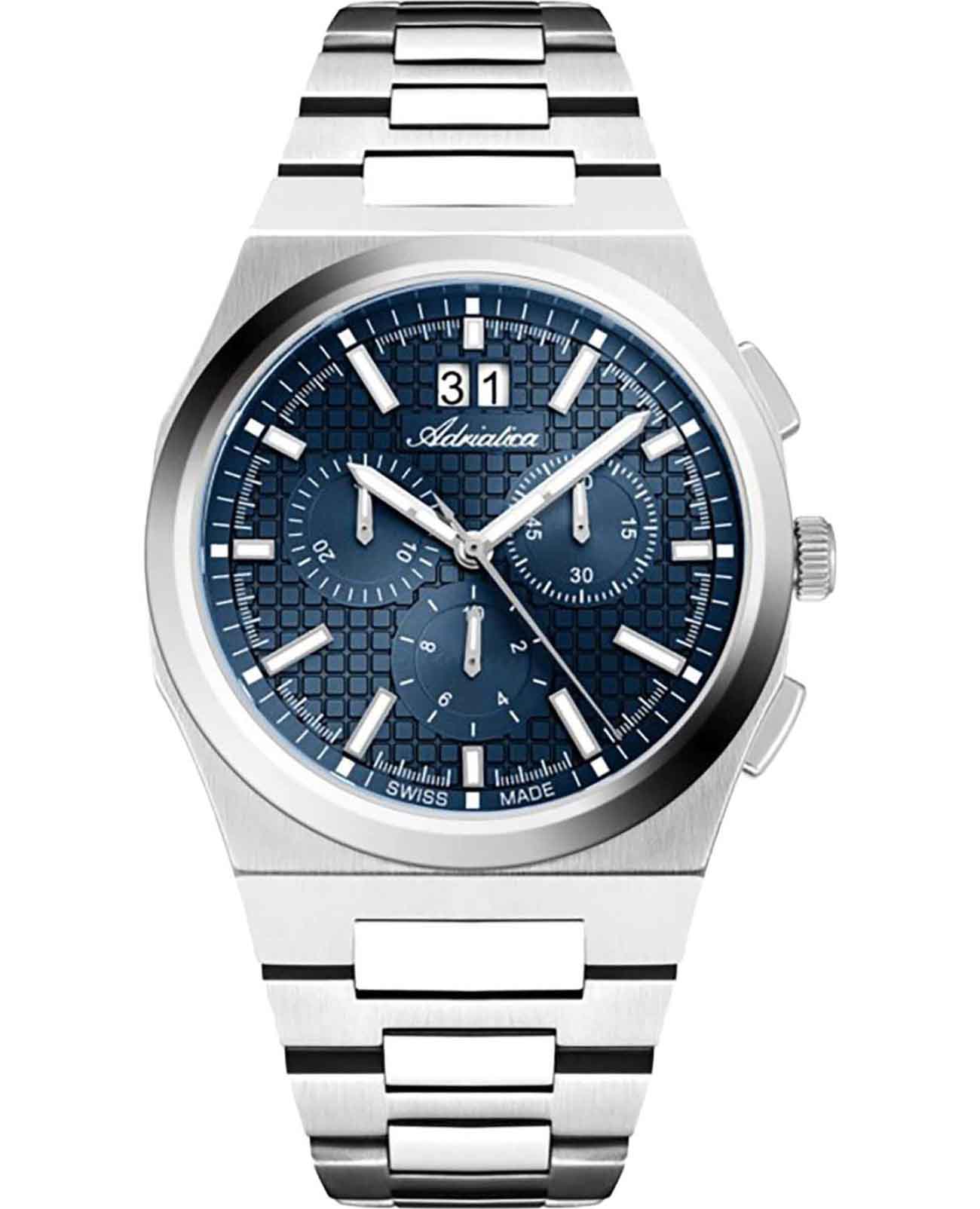 Мужские швейцарские часы-хронографХронографФункция позволяет измерять отрезки времени с особой точностью: часы, минуты, секунды. Верным признаком хронографа является наличие на циферблате 3 дополнительных окошек-счётчиков. с секундомеромСекундомерСекундоме́р — прибор, способный измерять интервалы времени с точностью до долей секунды.  Adriatica Premiere A8326.5115CH воплощают в себе элегантность и функциональность, идеально подходящие для современных мужчин, ценящих швейцарское качество. Их синий циферблат защищенный сапфировым стекломСапфировое стеклоПрочный и надёжный материал из кристалла сапфира синтетического происхождения, характеризующийся особой твёрдостью и устойчивостью к царапинам и повреждениям., заключен в корпус из нержавеющей стали диаметром 40 мм и толщиной 10 мм. Надежный кварцевый механизм с калибром Ronda 5030.B обеспечивает высокую точность, а водозащита 5 ATM делает часы устойчивыми к воздействию воды. Стальной браслет с раскладной застёжкойРаскладная застёжкаТакой тип застёжки используется только на браслетах из металла. Она никогда не раскрывается полностью, происходит разделение на 2 и более частей. Раскладывающая застёжка снизит вероятность потери часов к минимуму. обеспечивает комфортное и надежное ношение. Фактурный циферблат с метками в виде штрихов дополнен рисунком в клетку, а окошко даты находится в положении 12 часов, что добавляет практичности в повседневной жизни. Люминесцентное покрытиеЛюминесцентное покрытиеПозволяет считывать показания времени в темноте. Производители наносят на стрелки, часовые индексы, безель или поверхность циферблата светонакопительный состав, дающий холодное свечение. на стрелках и метках обеспечивает отличную видимость в темноте.