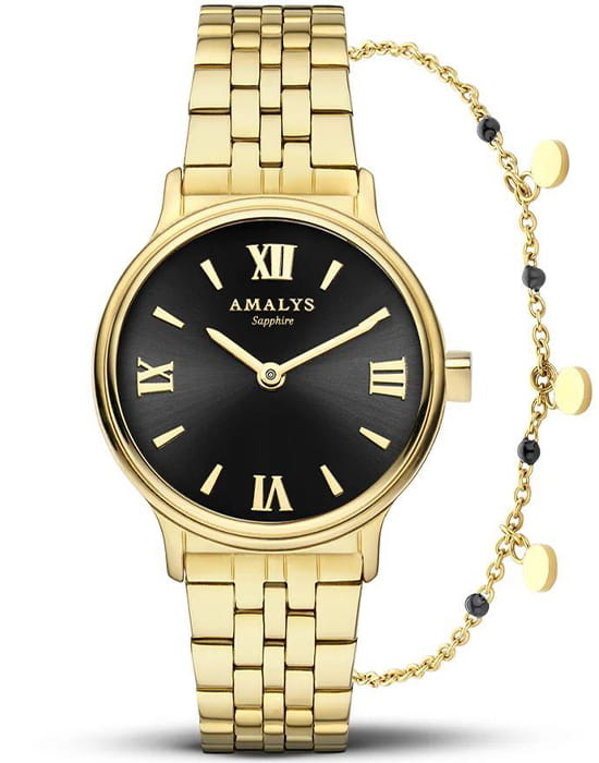 Amalys AMW-198 — женский набор, включающий часы и браслет, выполненный в гармоничном стиле. Круглый корпус диаметром 28 мм изготовлен из нержавеющей стали с PVDPVDУльтратонкое покрытие наносится в технике вакуумного напыления, сочетает в себе нитрид титана особой прочности со слоем золота или оксида хрома. Несёт в себе декоративную или защитную функцию.-покрытием тёплого золотистого оттенка, а браслет шириной 14 мм обеспечивает комфортное прилегание и подчёркивает изящный образ. Защитную функцию выполняет сапфировое стеклоСапфировое стеклоПрочный и надёжный материал из кристалла сапфира синтетического происхождения, характеризующийся особой твёрдостью и устойчивостью к царапинам и повреждениям., устойчивое к царапинам и сохраняющее прозрачность. Механизм — кварцевый, надёжный и точный. Браслет с PVDPVDУльтратонкое покрытие наносится в технике вакуумного напыления, сочетает в себе нитрид титана особой прочности со слоем золота или оксида хрома. Несёт в себе декоративную или защитную функцию.-покрытием снабжён раскладным замкомРаскладной замокДанный вариант застежки используется только на часах с металлическим браслетом. Отличительная особенность такого крепления в том, что длина браслета становится универсальной и вы можете самостоятельно отрегулировать нужный вам размер – застежка просто двигается по браслету часов., что делает ношение удобным и безопасным. Водозащита 5 ATM предохраняет модель от случайных брызг и дождя. Циферблат с римскими индексами и утончённым декоративным узором придаёт часам элегантность, а комплектный браслет завершает цельный и женственный образ.