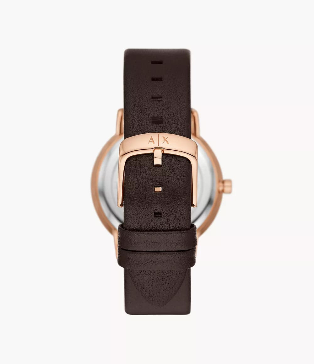 Кварцевые американские женские часы с минеральным стекломМинеральное стеклоМинеральное стекло представляет собой искусственно выращенный минерал кварца. Такое стекло отличается особой устойчивостью к повреждениям и царапинам. Уступает по некоторым качествам сапфировому стеклу. Armani Exchange AX5592, кварцевый механизм с высокой точностью. Класс водозащиты: 50 метров, позволит защитить корпус от случайных брызг или капель дождя. Корпус часов изготовлен из стали с IP-покрытиемIP-покрытиеМетод ионного напыления. Демонстрирует повышенную устойчивость к истиранию, окислению и химическим веществам. Под воздействием высокого давления и температуры около 1500°C молекулы металла надёжно соединяются с частицами корпуса часов.. Кожаный ремешок. Класс водозащиты: 50 метров, позволит защитить корпус от случайных брызг или капель дождя