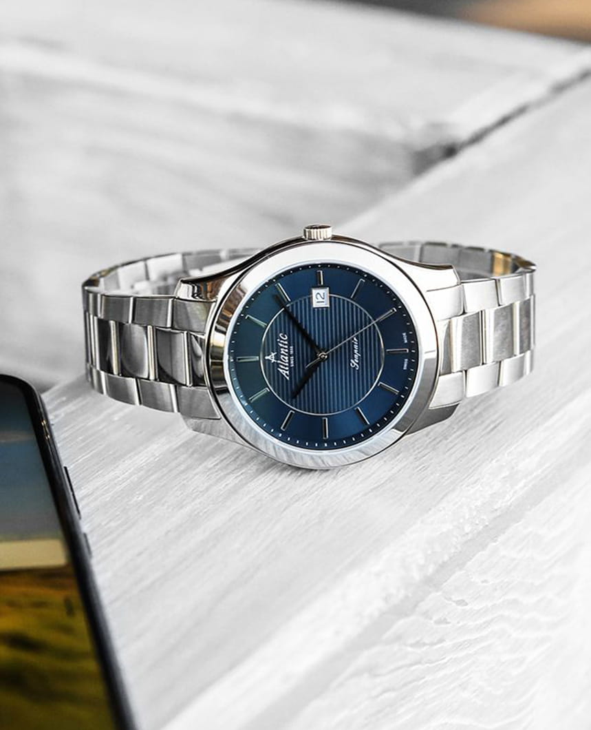Мужские швейцарские часы Atlantic Seaport 60335.41.51, кварцевый механизм с высокой точностью. Cапфировое стеклоСапфировое стеклоПрочный и надёжный материал из кристалла сапфира синтетического происхождения, характеризующийся особой твёрдостью и устойчивостью к царапинам и повреждениям. устойчивое к появлению царапин и обладающее высокой прозрачностью. Корпус и браслет часов изготовлены из нержавеющей стали. Окошко даты находится в положении 3 часов. Класс водозащиты: 50 метров, позволит защитить корпус от случайных брызг или капель дождя. Стальной браслет на раскладной застёжкеРаскладная застёжкаТакой тип застёжки используется только на браслетах из металла. Она никогда не раскрывается полностью, происходит разделение на 2 и более частей. Раскладывающая застёжка снизит вероятность потери часов к минимуму..
