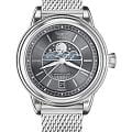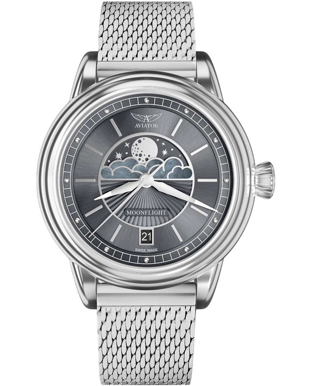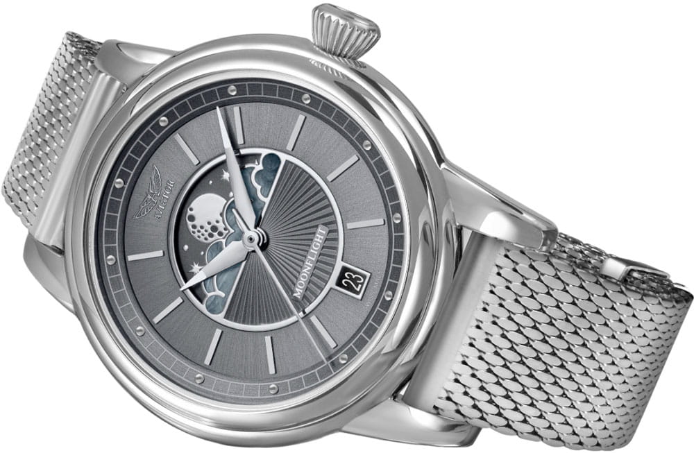 Aviator Douglas MoonFlight V.1.33.0.254.5 — элегантный дамский швейцарский Moonphase-хронограф с утончённой авиационной эстетикой. Корпус 36 мм из нержавеющей стали 316L обладает компактными пропорциями и удобным литым профилем. Циферблат в стиле Art Deco украшает усложнение фаз Луны в верхней половине, обрамлённой тонким кольцом облаков. Отмечено окно даты в положении «6 часов». Стрелки обработаны люминесцентным покрытиемЛюминесцентное покрытиеПозволяет считывать показания времени в темноте. Производители наносят на стрелки, часовые индексы, безель или поверхность циферблата светонакопительный состав, дающий холодное свечение. Superluminova — для уверенного считывания в темноте. Поверхность защищена сапфировым стекломСапфировое стеклоПрочный и надёжный материал из кристалла сапфира синтетического происхождения, характеризующийся особой твёрдостью и устойчивостью к царапинам и повреждениям. с антибликовым покрытиемАнтибликовое покрытиеСлой оксида металла в 0,13-0,3 микрон, благодаря которому стекло часов не бликует и не отражает свет. Антибликовое покрытие уменьшает отражение света в 10 раз, обеспечивая отличную читаемость показателей циферблата.. Сердце модели — швейцарский кварцевый механизм Ronda 708 с функцией отображения лунных фаз, 13 рубинами и возможностью работать до 54 месяцев без замены батареи. Завинчивающаяся задняя крышка с гравировкой Douglas DC-3 и герметичность до 100 метров создают надёжную основу для эксплуатации. Стальной браслет миланского плетения на раскладном замкеРаскладной замокДанный вариант застежки используется только на часах с металлическим браслетом. Отличительная особенность такого крепления в том, что длина браслета становится универсальной и вы можете самостоятельно отрегулировать нужный вам размер – застежка просто двигается по браслету часов., сочетая комфорт, элегантность и практичность. Лимитированная серия. Aviator Douglas MoonFlight  — это гармоничное сочетание авиационного наследия, женской элегантности и технической изысканности, воплощённое в элегантном и функциональном аксессуаре.
