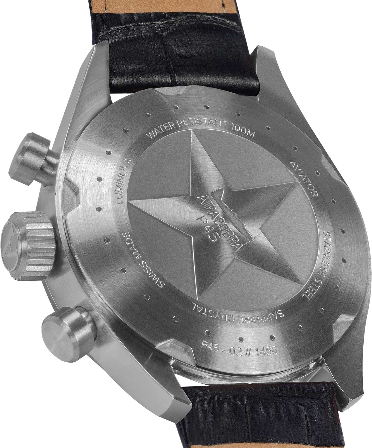 Aviator Airacobra V.2.25.0.169.4 — швейцарский GMT-хронограф в духе пилотских инструментов, объединяющий точность, удобство и лаконичный дизайн. Диаметр корпуса — 45 мм, выполнен из нержавеющей стали, что подчёркивает техническую надёжность в образе часов.