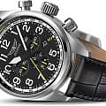Циферблат оформлен в классическом aviator-стиле: крупные арабские цифры, широкие стрелки и чёткое деление минут позволяют считывать время мгновенно. Стрелки и метки покрыты люминесцентным покрытиемЛюминесцентное покрытиеПозволяет считывать показания времени в темноте. Производители наносят на стрелки, часовые индексы, безель или поверхность циферблата светонакопительный состав, дающий холодное свечение. для отличной читаемости при слабом освещении. Часы оснащены функцией GMT — дополнительная стрелка позволяет отслеживать второй часовой пояс, а яркий внешний вращающийся безельБезельВнешний ободок, закрепляющий стекло. В спортивных часах так называется поворотное кольцо с делениями на циферблате, выполняет роль таймера – замеряет отрезки времени на шкале. Неподвижный безель – элемент декора. Однонаправленно вращающийся безель на дайверских часах позволяет фиксировать моменты погружения и выныривания на поверхность.