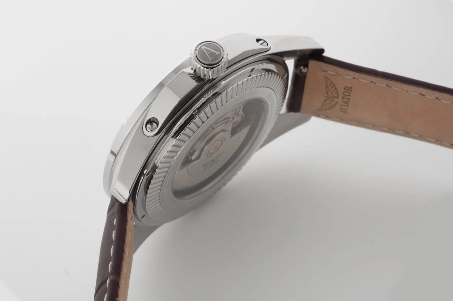 Aviator Airacobra V.3.39.0.334.4 — швейцарские часы в классике авиадизайна, сочетающие безупречную читаемость и высокую надёжность. Корпус диаметром 42,8 мм выполнен из нержавеющей стали 316L. Матовый циферблат с крупными арабскими цифрами, широкими стрелками и контрастной шкалой минут обеспечивает точную и быструю считываемость информации — как и положено настоящим пилотским часам. У отметки «3 часа» — окошко даты. Часовые метки и стрелки покрыты люминесцентным покрытиемЛюминесцентное покрытиеПозволяет считывать показания времени в темноте. Производители наносят на стрелки, часовые индексы, безель или поверхность циферблата светонакопительный состав, дающий холодное свечение. Superluminova, позволяющим легко определять время даже в тёмное время суток. Поверхность защищена прочным сапфировым стекломСапфировое стеклоПрочный и надёжный материал из кристалла сапфира синтетического происхождения, характеризующийся особой твёрдостью и устойчивостью к царапинам и повреждениям. с антибликовым покрытием, устойчивым к царапинам. Сердце модели — швейцарский механизм Sellita SW 200-1, известный своей точностью и долговечностью. Водозащита 100 метров, позволит плавать, нырять и заниматься другими водными видами спорта. Завинчивающаяся головка и задняя крышка обеспечивают уверенную ударопрочностьУдаропрочный корпусМеханизм заключён в корпус, выполненный из современных материалов, устойчивых к ударам, механическим повреждениям и падению с высоты: инновационный пластик, карбон, нержавеющая сталь, титан. и надёжную защиту от влаги и пыли. В механизме 26 камней, запас хода до 38 часов. Модель дополнена кожаным ремешком с выразительной текстурой и классическим стилем, закреплённым с помощью стандартной застежки — для максимального комфорта и лёгкости в повседневном использовании. Aviator — это образец лётной точности, инженерной чёткости и сдержанной роскоши, идеально подходящий для тех, кто ценит функциональность и уверенность в каждом элементе.