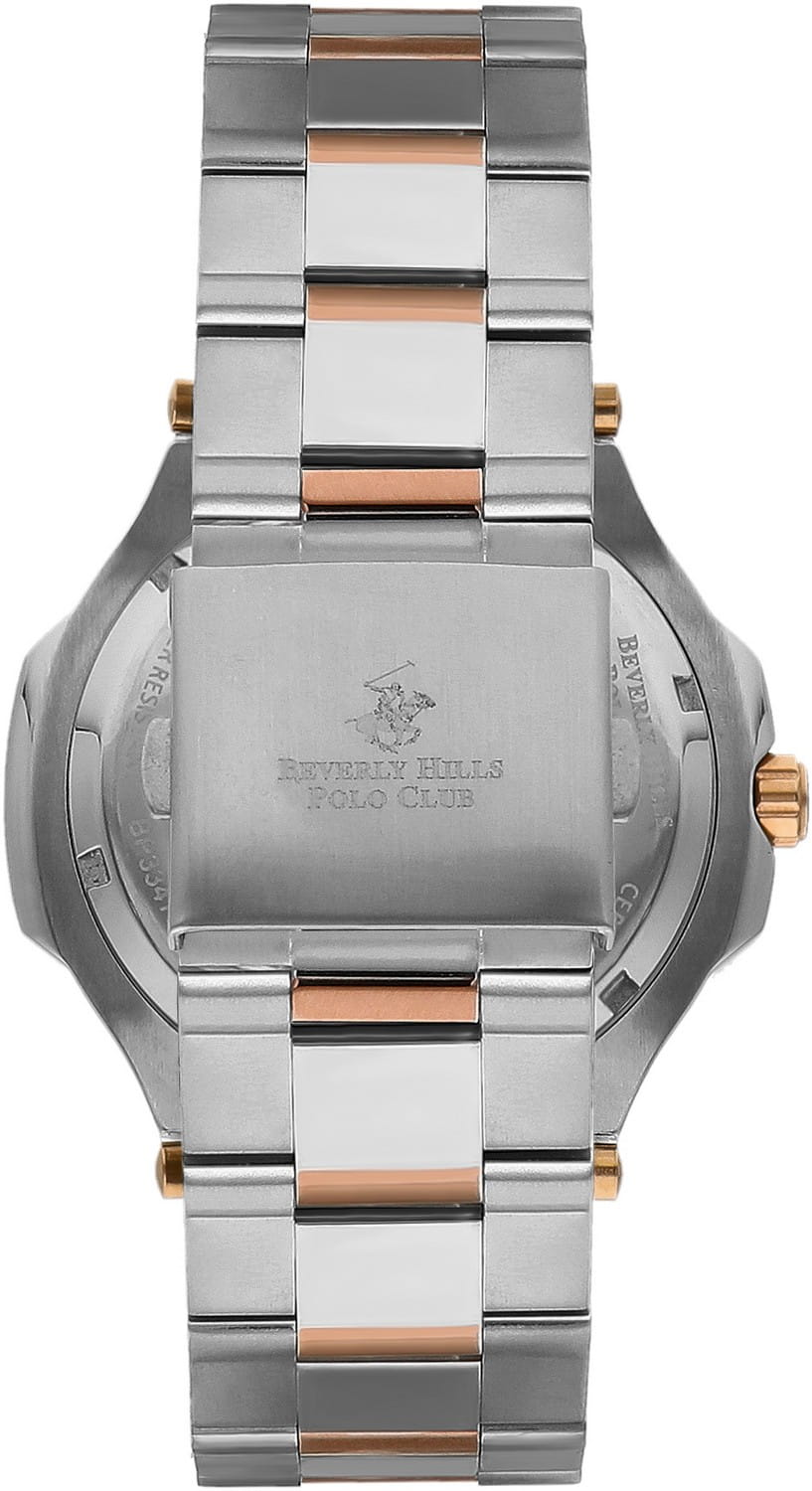 Американские мужские часы Beverly Hills Polo Club BP3635X.590, автоматический механизм MIYOTA с высокой точностью. Минеральное стеклоМинеральное стеклоМинеральное стекло представляет собой искусственно выращенный минерал кварца. Такое стекло отличается особой устойчивостью к повреждениям и царапинам. Уступает по некоторым качествам сапфировому стеклу. устойчивое к мелким механическим повреждениям. Класс водозащиты: 50 метров, позволит защитить корпус от случайных брызг или капель дождя. Корпус часов изготовлен из стали. Стальной браслет с IP-покрытиемIP-покрытиеМетод ионного напыления. Демонстрирует повышенную устойчивость к истиранию, окислению и химическим веществам. Под воздействием высокого давления и температуры около 1500°C молекулы металла надёжно соединяются с частицами корпуса часов. на раскладной застёжкеРаскладная застёжкаТакой тип застёжки используется только на браслетах из металла. Она никогда не раскрывается полностью, происходит разделение на 2 и более частей. Раскладывающая застёжка снизит вероятность потери часов к минимуму..