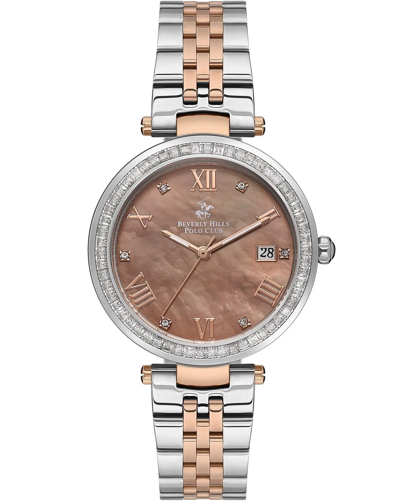 Часы Beverly Hills Polo Club BP3583X.520 — элегантная женская модель, сочетающая классический дизайн и современные технологии. Корпус диаметром 34 мм выполнен из нержавеющей стали с PVD-покрытиемPVDУльтратонкое покрытие наносится в технике вакуумного напыления, сочетает в себе нитрид титана особой прочности со слоем золота или оксида хрома. Несёт в себе декоративную или защитную функцию. серебристого цвета. Перламутровый циферблат украшен римскими цифрами и кристаллами, придающими часам изысканный вид, и защищён минеральным стекломМинеральное стеклоМинеральное стекло представляет собой искусственно выращенный минерал кварца. Такое стекло отличается особой устойчивостью к повреждениям и царапинам. Уступает по некоторым качествам сапфировому стеклу., устойчивым к царапинам.