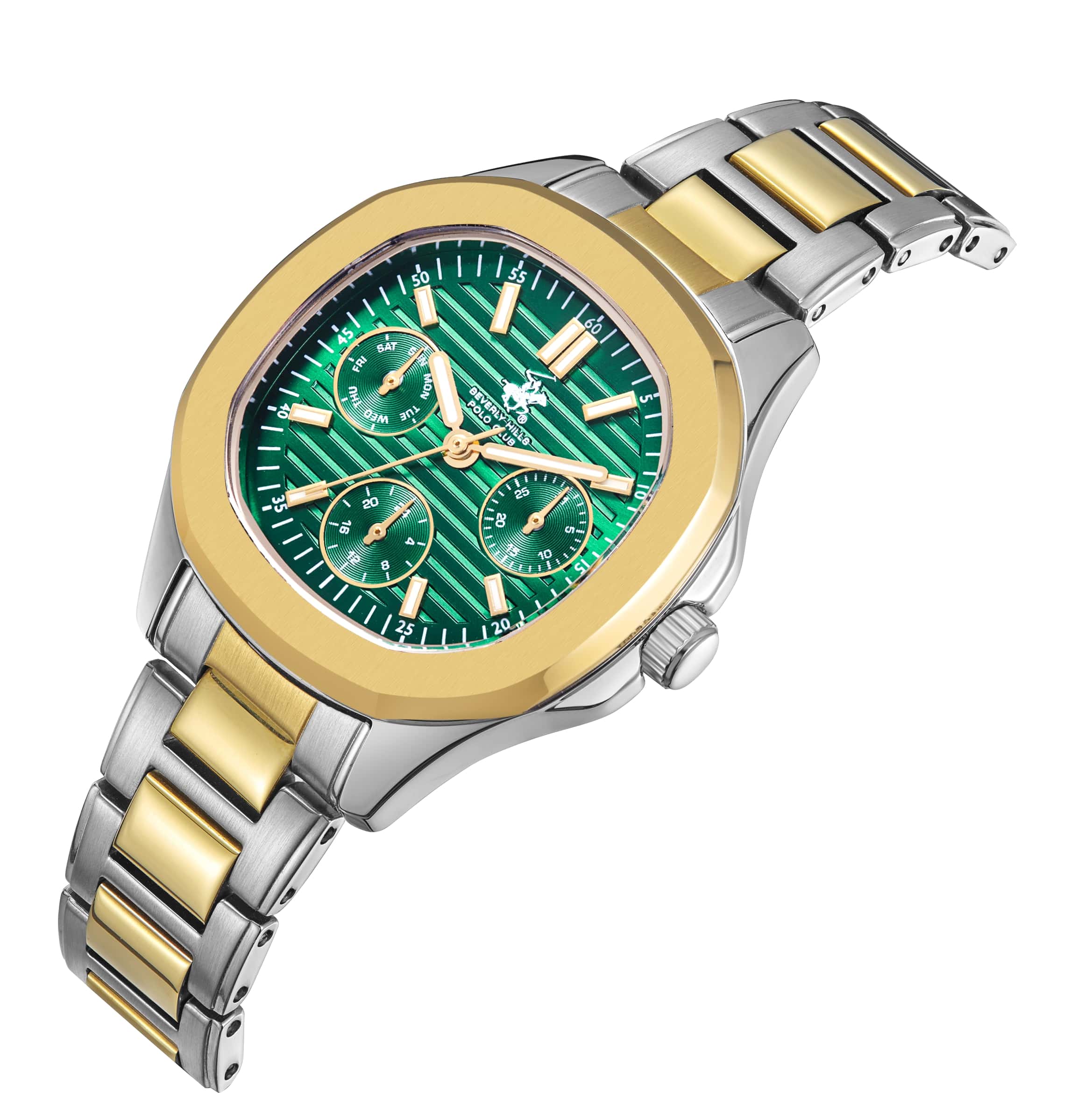 Beverly Hills Polo Club BP3700C.270 – элегантные женские часы, сочетающие стильный дизайн и высокую функциональность. Корпус диаметром 34 мм выполнен из суперметалла, обеспечивающего прочность и долговечность. Циферблат украшен, и защищён минеральным стекломМинеральное стеклоМинеральное стекло представляет собой искусственно выращенный минерал кварца. Такое стекло отличается особой устойчивостью к повреждениям и царапинам. Уступает по некоторым качествам сапфировому стеклу., устойчивым к царапинам. БезельБезельВнешний ободок, закрепляющий стекло. В спортивных часах так называется поворотное кольцо с делениями на циферблате, выполняет роль таймера – замеряет отрезки времени на шкале. Неподвижный безель – элемент декора. Однонаправленно вращающийся безель на дайверских часах позволяет фиксировать моменты погружения и выныривания на поверхность. с PVD-покрытиемPVDУльтратонкое покрытие наносится в технике вакуумного напыления, сочетает в себе нитрид титана особой прочности со слоем золота или оксида хрома. Несёт в себе декоративную или защитную функцию.. Часы оснащены точным кварцевым механизмом, гарантирующим надёжное отображение времени. Браслет из нержавеющей стали с PVD-покрытиемPVDУльтратонкое покрытие наносится в технике вакуумного напыления, сочетает в себе нитрид титана особой прочности со слоем золота или оксида хрома. Несёт в себе декоративную или защитную функцию. на застёжке-бабочке с кнопкамиЗастёжка "бабочка"Такой вид застёжки дополняется предохранителями, помогающими избежать случайного раскрытия браслета. Обладают изящным исполнением. , обеспечивающей комфортное ношение и надёжную фиксацию на запястье. Водозащита до 50 метров (5 ATM) позволяет использовать часы в повседневной жизни, включая кратковременное погружение в воду.