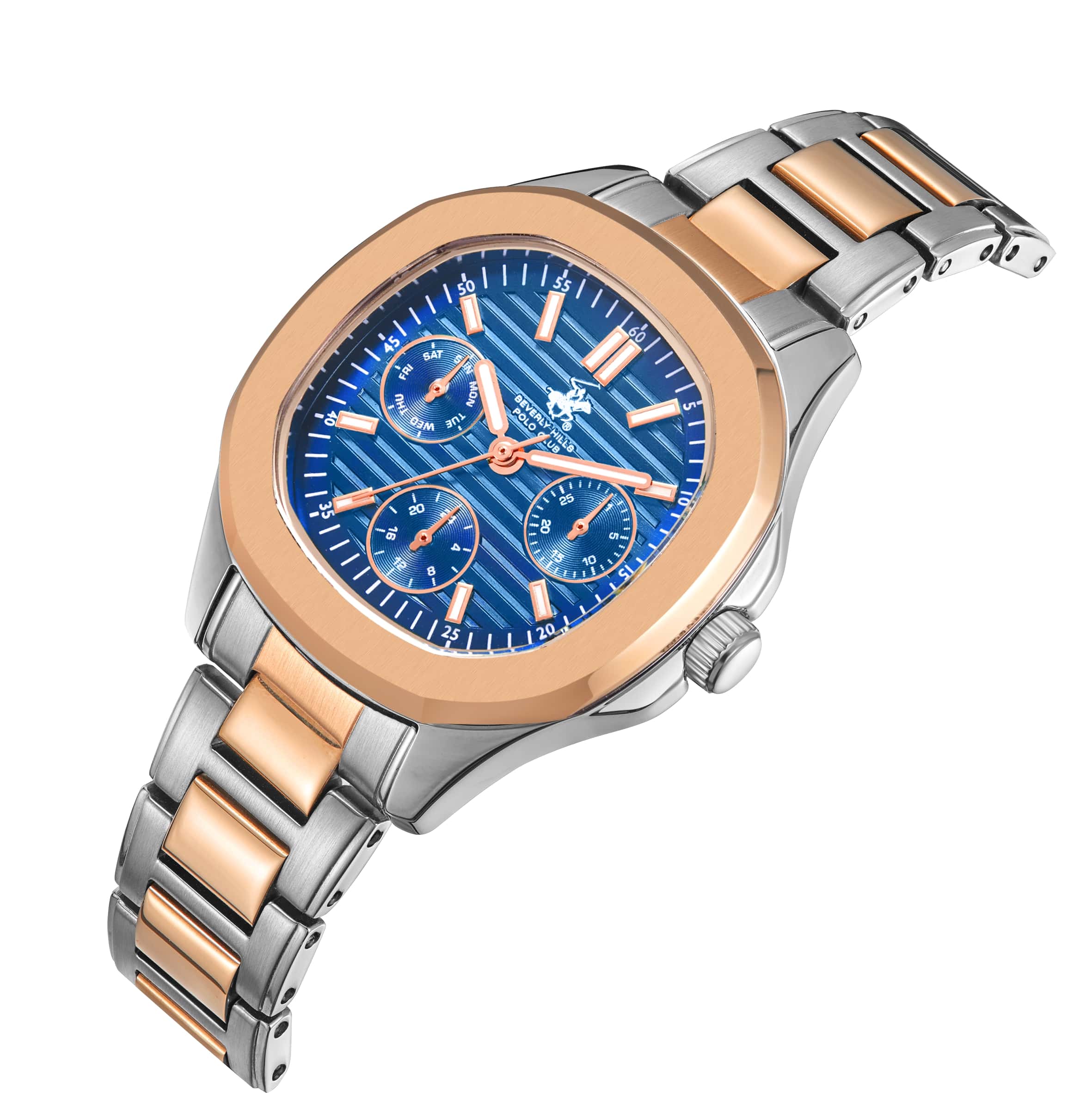 Beverly Hills Polo Club BP3700C.590 – элегантные женские часы, сочетающие стильный дизайн и высокую функциональность. Корпус диаметром 34 мм выполнен из суперметалла, обеспечивающего прочность и долговечность. Циферблат украшен, и защищён минеральным стекломМинеральное стеклоМинеральное стекло представляет собой искусственно выращенный минерал кварца. Такое стекло отличается особой устойчивостью к повреждениям и царапинам. Уступает по некоторым качествам сапфировому стеклу., устойчивым к царапинам. БезельБезельВнешний ободок, закрепляющий стекло. В спортивных часах так называется поворотное кольцо с делениями на циферблате, выполняет роль таймера – замеряет отрезки времени на шкале. Неподвижный безель – элемент декора. Однонаправленно вращающийся безель на дайверских часах позволяет фиксировать моменты погружения и выныривания на поверхность. с PVD-покрытиемPVDУльтратонкое покрытие наносится в технике вакуумного напыления, сочетает в себе нитрид титана особой прочности со слоем золота или оксида хрома. Несёт в себе декоративную или защитную функцию.. Часы оснащены точным кварцевым механизмом, гарантирующим надёжное отображение времени. Браслет из нержавеющей стали с PVD-покрытиемPVDУльтратонкое покрытие наносится в технике вакуумного напыления, сочетает в себе нитрид титана особой прочности со слоем золота или оксида хрома. Несёт в себе декоративную или защитную функцию. на застёжке-бабочке с кнопкамиЗастёжка "бабочка"Такой вид застёжки дополняется предохранителями, помогающими избежать случайного раскрытия браслета. Обладают изящным исполнением. , обеспечивающей комфортное ношение и надёжную фиксацию на запястье. Водозащита до 50 метров (5 ATM) позволяет использовать часы в повседневной жизни, включая кратковременное погружение в воду.