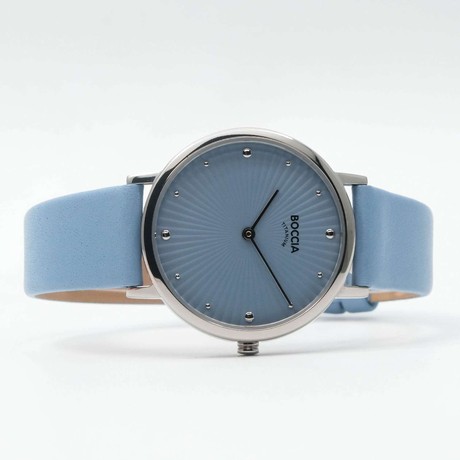 Элегантные женские часы Boccia 3365-01 станут неотъемлемой частью вашего повседневного стиля. Эти часы оборудованы надежным кварцевым механизмом Miyota GL22, обеспечивающим высокую точность и бесперебойную работу. Центральные часовая и минутная стрелки изящно выделяются на стильном голубом циферблате, создавая гармоничный и современный образ. Корпус часов выполнен из суперлегкого титана, что делает их не только прочными, но и комфортными в ношении. Круглый корпус диаметром 34 мм придаёт часам классический и универсальный вид. Голубой кожаный ремешок с традиционной застежкой идеально дополняет общий дизайн, добавляя яркий акцент. Прочное минеральное стеклоМинеральное стеклоМинеральное стекло представляет собой искусственно выращенный минерал кварца. Такое стекло отличается особой устойчивостью к повреждениям и царапинам. Уступает по некоторым качествам сапфировому стеклу. защищает циферблат от мелких механических повреждений, обеспечивая долговечность и сохранение первоначального внешнего вида. Водостойкость уровня WR 50 позволяет не беспокоиться о попадании влаги при мытье рук или в дождливую погоду.