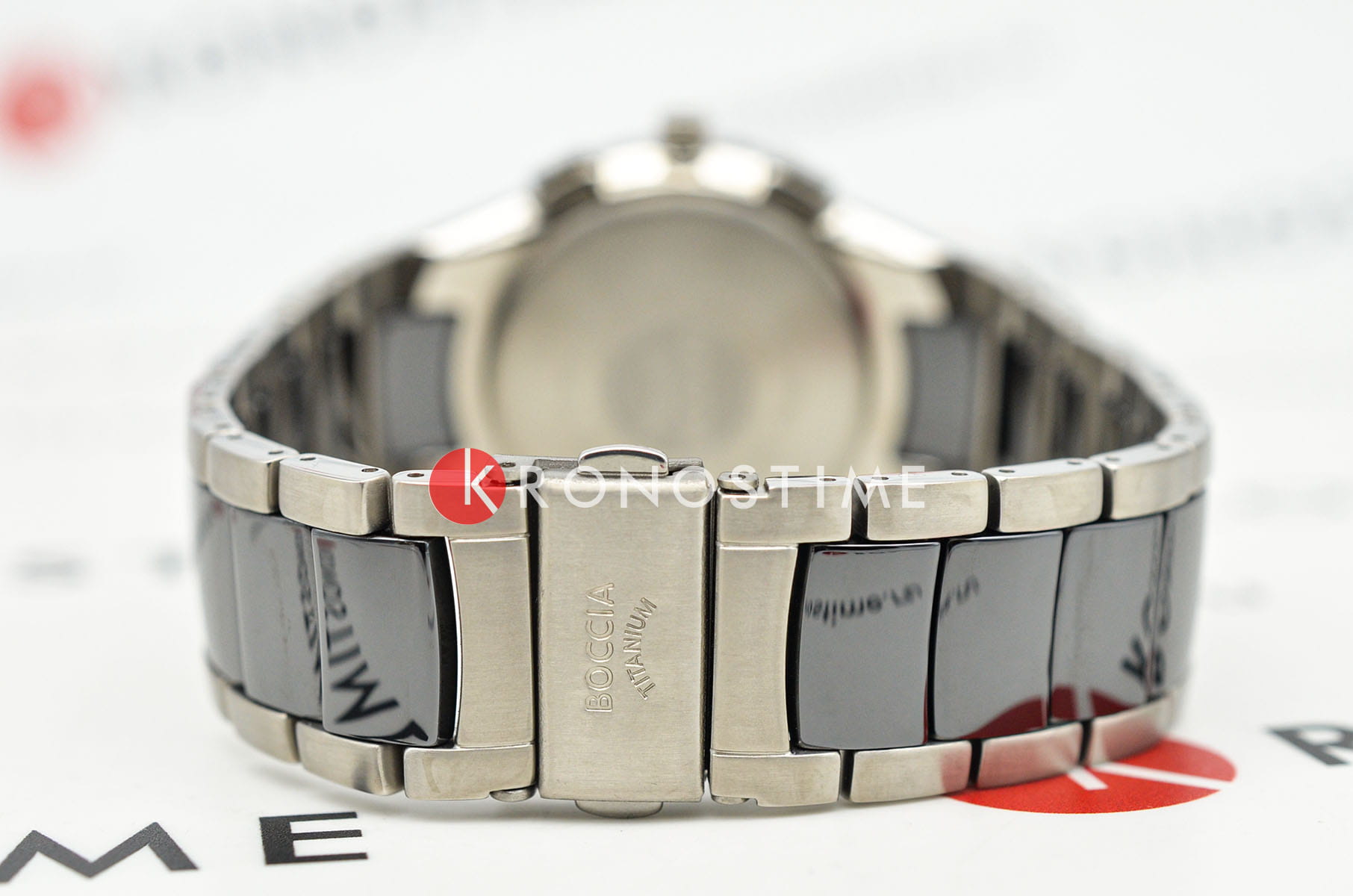 Мужские немецкие титановые часы-хронографХронографФункция позволяет измерять отрезки времени с особой точностью: часы, минуты, секунды. Верным признаком хронографа является наличие на циферблате 3 дополнительных окошек-счётчиков. Boccia Titanium 3748-01, кварцевый механизм с высокой точностью. Сапфировое стеклоСапфировое стеклоПрочный и надёжный материал из кристалла сапфира синтетического происхождения, характеризующийся особой твёрдостью и устойчивостью к царапинам и повреждениям. устойчивое к мелким механическим повреждениям. Корпус изготовлен из титана. На циферблате расположены три дополнительных индикатора и окошко даты. Класс водозащиты: 50 метров, позволит защитить корпус от случайных брызг или капель дождя. Браслет из титана с керамическими вставками на раскладной застёжкеРаскладная застёжкаТакой тип застёжки используется только на браслетах из металла. Она никогда не раскрывается полностью, происходит разделение на 2 и более частей. Раскладывающая застёжка снизит вероятность потери часов к минимуму..