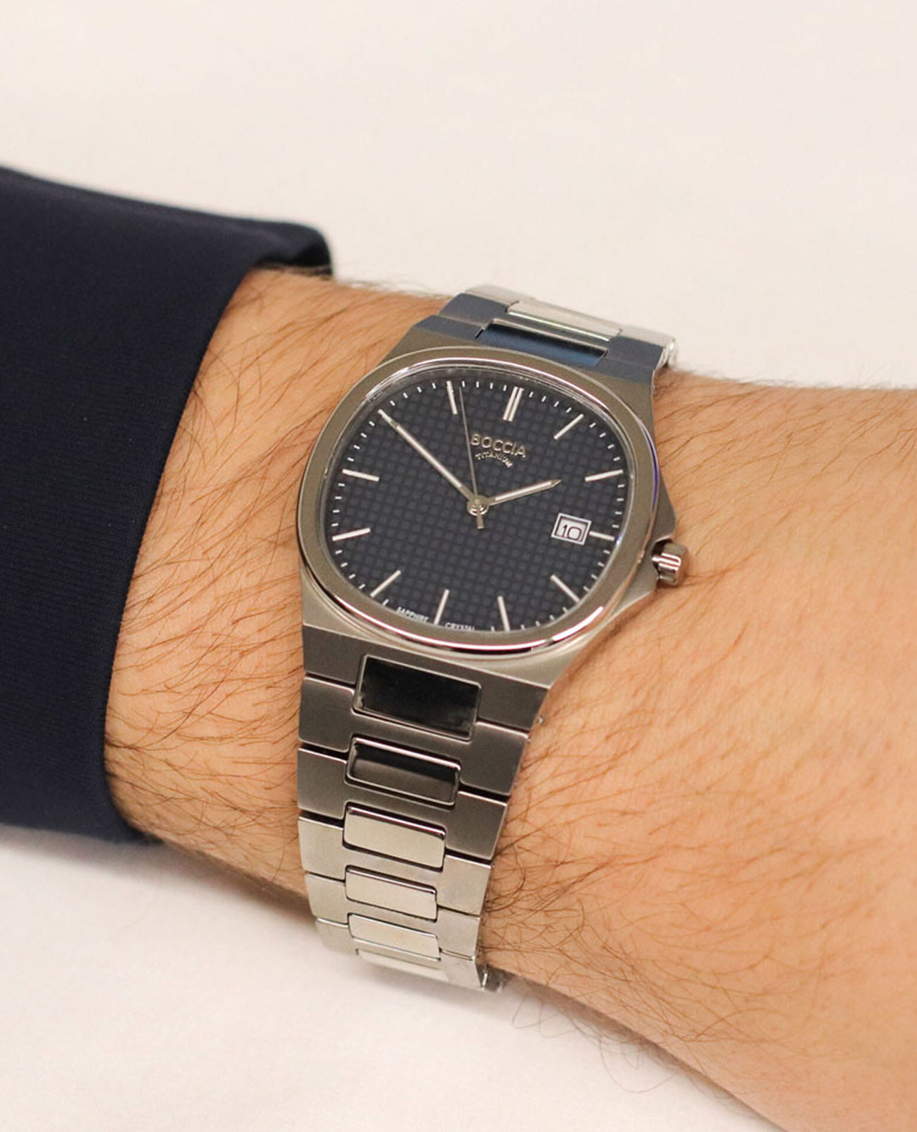 Мужские немецкие титановые часы Boccia TitaniumSquare 3657-04, кварцевый механизм с высокой точностью. Сапфировое стеклоСапфировое стеклоПрочный и надёжный материал из кристалла сапфира синтетического происхождения, характеризующийся особой твёрдостью и устойчивостью к царапинам и повреждениям. устойчивое к появлению царапин, обладающее высокой прозрачностью. Квадратный корпус изготовлен из титана. Метки в виде штрихов. Окошко даты в положении 3 часов. Класс водозащиты: 50 метров, позволит защитить корпус от случайных брызг или капель дождя. Стальной браслет миланского плетения на раскладной застёжкеРаскладная застёжкаТакой тип застёжки используется только на браслетах из металла. Она никогда не раскрывается полностью, происходит разделение на 2 и более частей. Раскладывающая застёжка снизит вероятность потери часов к минимуму..