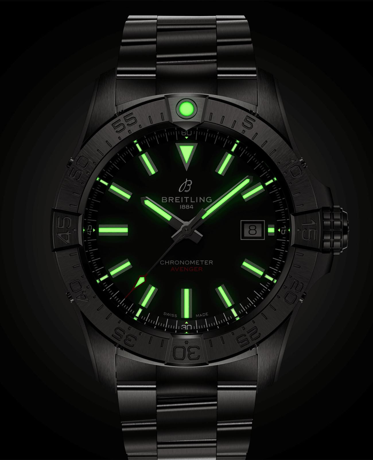 Мужские наручные часы Breitling Avenger Automatic 42 A17328101B1A1 с надёжным автоматическим механизмом. Сапфировое стеклоСапфировое стеклоПрочный и надёжный материал из кристалла сапфира синтетического происхождения, характеризующийся особой твёрдостью и устойчивостью к царапинам и повреждениям. повышенной прозрачности, устойчивое к мелким механическим повреждениям. Вращающийся безельБезельВнешний ободок, закрепляющий стекло. В спортивных часах так называется поворотное кольцо с делениями на циферблате, выполняет роль таймера – замеряет отрезки времени на шкале. Неподвижный безель – элемент декора. Однонаправленно вращающийся безель на дайверских часах позволяет фиксировать моменты погружения и выныривания на поверхность.. Окошко даты находится в положении 3 часа. Стрелки и метки с люминесцентным покрытиемЛюминесцентное покрытиеПозволяет считывать показания времени в темноте. Производители наносят на стрелки, часовые индексы, безель или поверхность циферблата светонакопительный состав, дающий холодное свечение.. Стальной браслет на стандартной застёжке. Класс водозащиты: 300 метров, позволит плавать, нырять и заниматься другими водными видами спорта.