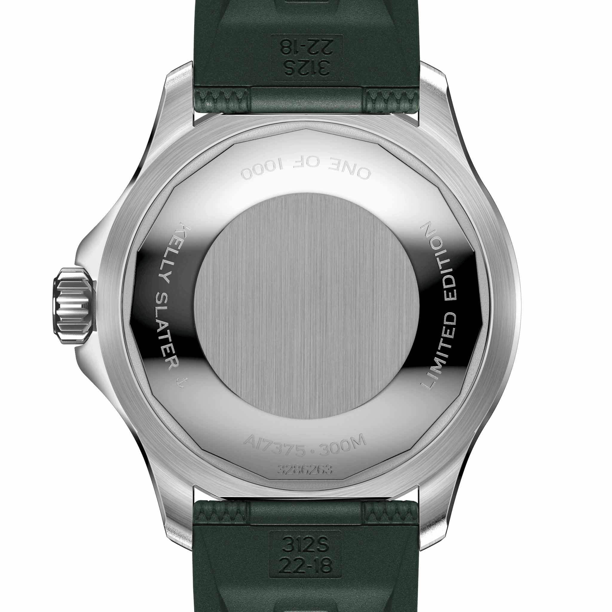 Мужские водонепроницаемые швейцарские часы Breitling Superocean Automatic 42 Kelly Slater A173751A1O1S1, механический механизм (автоматический калибр) с высокой точностью. Сапфировое стеклоСапфировое стеклоПрочный и надёжный материал из кристалла сапфира синтетического происхождения, характеризующийся особой твёрдостью и устойчивостью к царапинам и повреждениям. устойчивое к появлению царапин, обладающее высокой прозрачностью. Класс водозащиты: 300 метров, позволит плавать, нырять и заниматься другими водными видами спорта. Корпус часов изготовлен из стали. Силиконовый ремешок с раскладной застёжкойРаскладная застёжкаТакой тип застёжки используется только на браслетах из металла. Она никогда не раскрывается полностью, происходит разделение на 2 и более частей. Раскладывающая застёжка снизит вероятность потери часов к минимуму.. Стрелки и метки с люминесцентным покрытиемЛюминесцентное покрытиеПозволяет считывать показания времени в темноте. Производители наносят на стрелки, часовые индексы, безель или поверхность циферблата светонакопительный состав, дающий холодное свечение.. Широкие стрелки и индексы с люминесцентным покрытиемЛюминесцентное покрытиеПозволяет считывать показания времени в темноте. Производители наносят на стрелки, часовые индексы, безель или поверхность циферблата светонакопительный состав, дающий холодное свечение. обеспечивают легкую читаемость под водой. Вращающийся стальной безельБезельВнешний ободок, закрепляющий стекло. В спортивных часах так называется поворотное кольцо с делениями на циферблате, выполняет роль таймера – замеряет отрезки времени на шкале. Неподвижный безель – элемент декора. Однонаправленно вращающийся безель на дайверских часах позволяет фиксировать моменты погружения и выныривания на поверхность. с люминесцентным покрытиемЛюминесцентное покрытиеПозволяет считывать показания времени в темноте. Производители наносят на стрелки, часовые индексы, безель или поверхность циферблата светонакопительный состав, дающий холодное свечение. Superluminova из нержавеющей стали и керамики, защищенный от царапин, никогда не изнашивается и не выцветает.