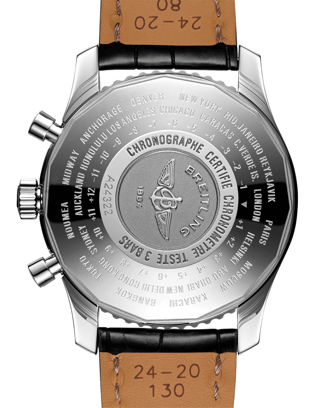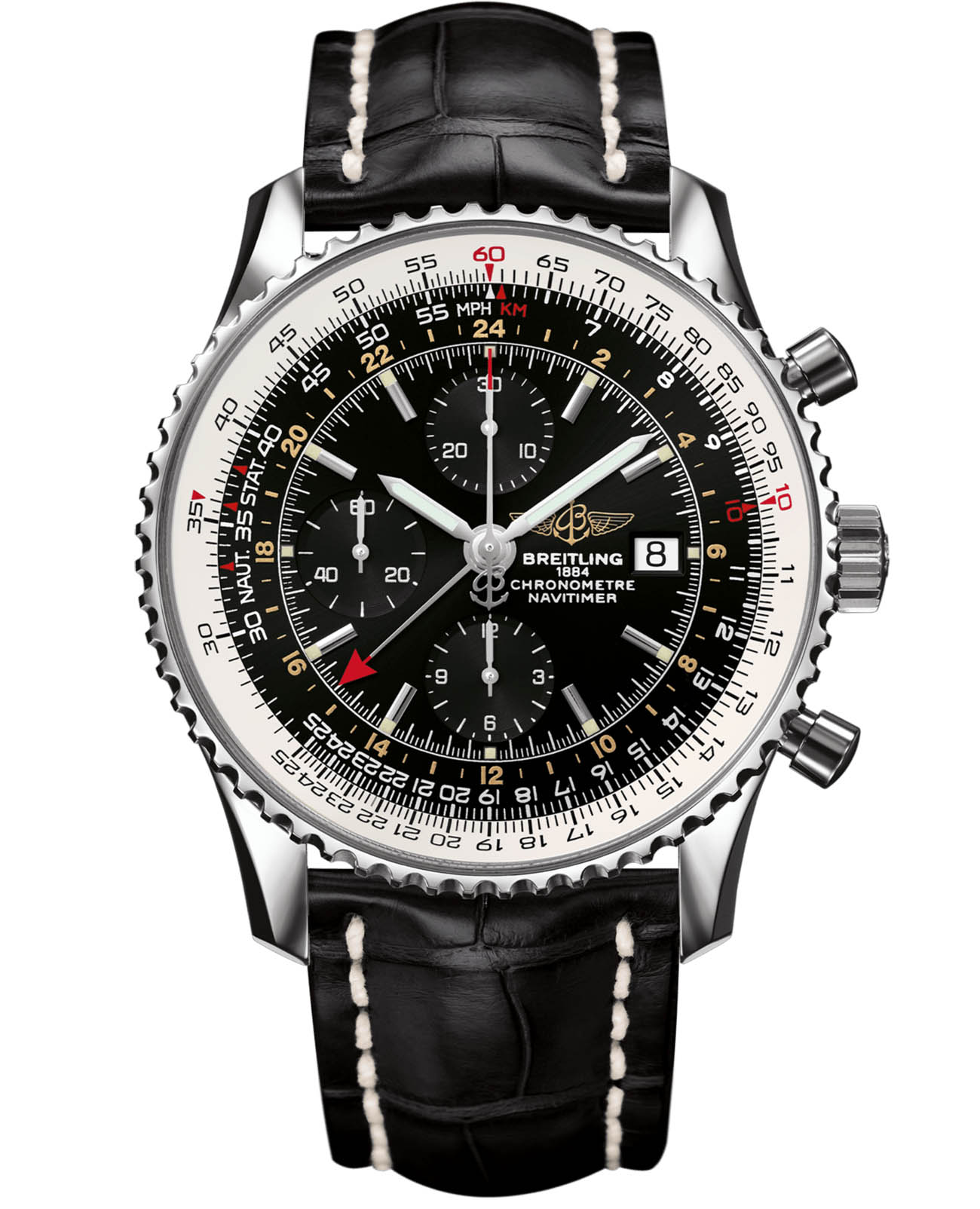 Мужские швейцарские часы-хронограф с секундомером Breitling Navitimer Chronograph GMT 46 A24322121B1P1, механический механизм (автоматический калибр) с высокой точностью. Сапфировое стеклоСапфировое стеклоПрочный и надёжный материал из кристалла сапфира синтетического происхождения, характеризующийся особой твёрдостью и устойчивостью к царапинам и повреждениям. устойчивое к появлению царапин, обладающее высокой прозрачностью. Класс водозащиты: 30 метров, позволит защитить корпус от случайных брызг или капель дождя. Корпус часов изготовлен из нержавеющей стали. Браслет из кожи аллигатора на складной клипсе. Стрелки и метки с люминесцентным покрытиемЛюминесцентное покрытиеПозволяет считывать показания времени в темноте. Производители наносят на стрелки, часовые индексы, безель или поверхность циферблата светонакопительный состав, дающий холодное свечение.. Шкала тахиметра на циферблате. Окошко даты находится в положении 3 часов. Калибр Breitling Caliber 24