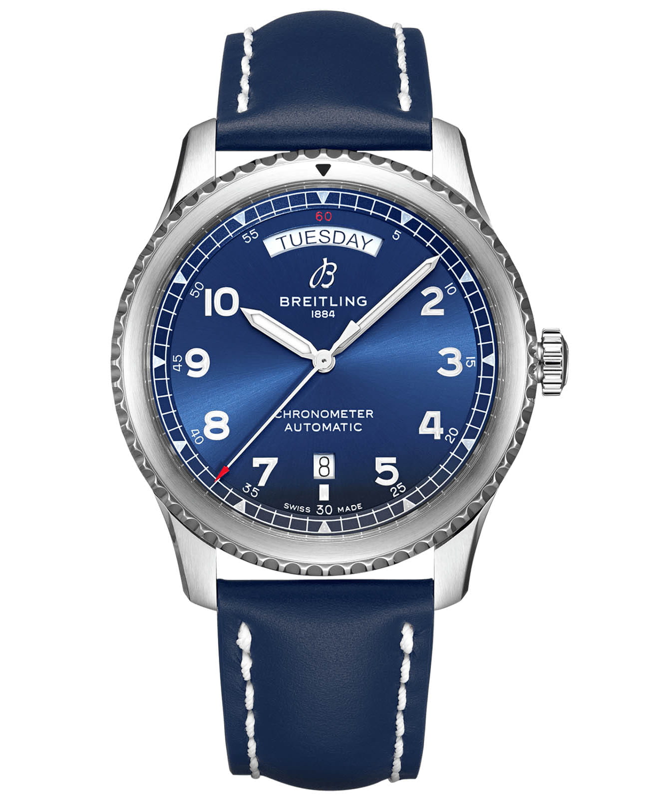 Модель Aviator 8 Automatic Day & Date 41 A45330101C1X3 отображает день недели, дату и время. Индикатор дня недели размещен в положении «12 часов» симметрично дате, в положении «6 часов». «Сердцем» модели этих автоматических наручных часов является калибр Breitling Caliber 45, а двунаправленный ротор автоподзавода обеспечивает запас хода свыше 40 часов.