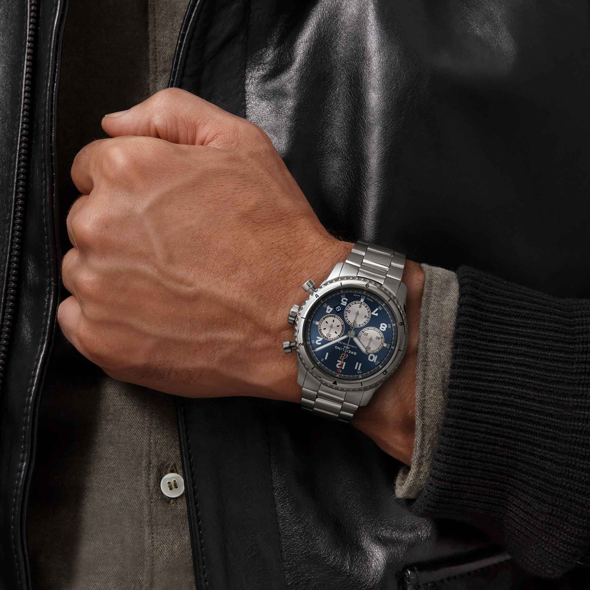 Хронограф Aviator 8 B01 43 оснащен калибром собственной мануфактуры Breitling Caliber 01. 43-миллиметровые часы с автоподзаводом с впечатляющим запасом хода более 70 часов. На дисплее установлены 30-минутный и 12-часовой счетчики, а также окно даты. Изюминкой этой новой линейки являются часы Aviator 8 B01 Chronograph 43, выполненные из стали с черным или синим циферблатом или из красного золота 18 карат с бронзовым циферблатом, каждый из которых имеет отличительные элементы дизайна в виде контрастных вспомогательных циферблатов. Хронометр, сертифицированный Сертификат COSCСертификат COSCОфициальный сертификат, подтверждающий то, что часы ходят с особо высокой точностью. Для получения документа часы подвергаются тестовым испытаниям, разработанным швейцарским институтом тестирования хронометров COSC. Допустимая норма для механических часов -4/+6 секунд в день, для кварцевых моделей +/- 0,07 секунд в день., представлен на стальном браслете или ремешке из кожи аллигатора и имеет прозрачную сапфировую заднюю крышку.