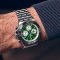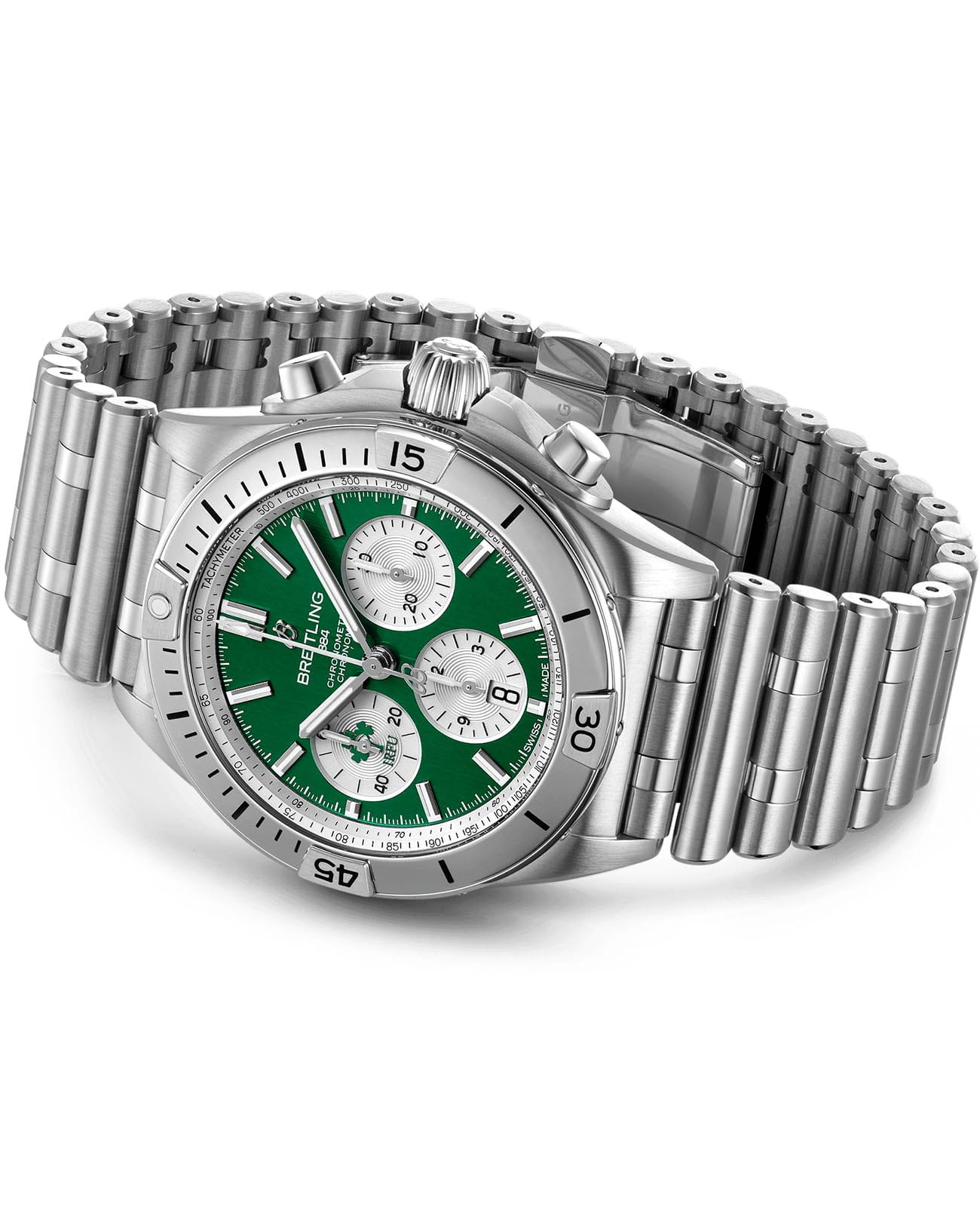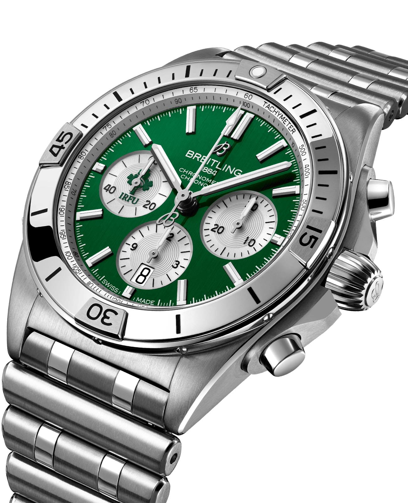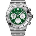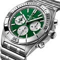 Лимитированные мужские швейцарские часы-хронографХронографФункция позволяет измерять отрезки времени с особой точностью: часы, минуты, секунды. Верным признаком хронографа является наличие на циферблате 3 дополнительных окошек-счётчиков. с секундомеромСекундомерСекундоме́р — прибор, способный измерять интервалы времени с точностью до долей секунды. Breitling Chronomat B01 42 Ireland AB0134A91L1A1, механический механизм (автоматический калибр) с высокой точностью. Основанный на хронографе Frecce Tricolori, который был разработан и выпущен в 1983 году в сотрудничестве со знаменитой итальянской авиационной эскадрильей, Chronomat стильно отпраздновал столетие Breitling и ознаменовал возвращение механическому хронографу его законного места в бренде, который построил свою мировую репутацию на этих невероятных часах. Сапфировое стеклоСапфировое стеклоПрочный и надёжный материал из кристалла сапфира синтетического происхождения, характеризующийся особой твёрдостью и устойчивостью к царапинам и повреждениям. устойчивое к появлению царапин, обладающее высокой прозрачностью. Класс водозащиты: 200 метров, позволит плавать, нырять и заниматься другими водными видами спорта. Корпус и браслет часов изготовлены из нержавеющей стали. Часы имеют сертификат COSCСертификат COSCОфициальный сертификат, подтверждающий то, что часы ходят с особо высокой точностью. Для получения документа часы подвергаются тестовым испытаниям, разработанным швейцарским институтом тестирования хронометров COSC. Допустимая норма для механических часов -4/+6 секунд в день, для кварцевых моделей +/- 0,07 секунд в день.. Стрелки и метки с люминесцентным покрытиемЛюминесцентное покрытиеПозволяет считывать показания времени в темноте. Производители наносят на стрелки, часовые индексы, безель или поверхность циферблата светонакопительный состав, дающий холодное свечение.. Шкала тахиметраТахиметрРазмеченная шкала, располагается на ободке или безеле часов. Тахиметр позволяет рассчитать скорость на определённом участке пути, расстояние измеряется в километрах или милях. на циферблате. Окошко даты находится в положении 6 часов. Браслет с застёжкой-бабочкой с кнопкамиЗастёжка "бабочка"Такой вид застёжки дополняется предохранителями, помогающими избежать случайного раскрытия браслета. Обладают изящным исполнением. .