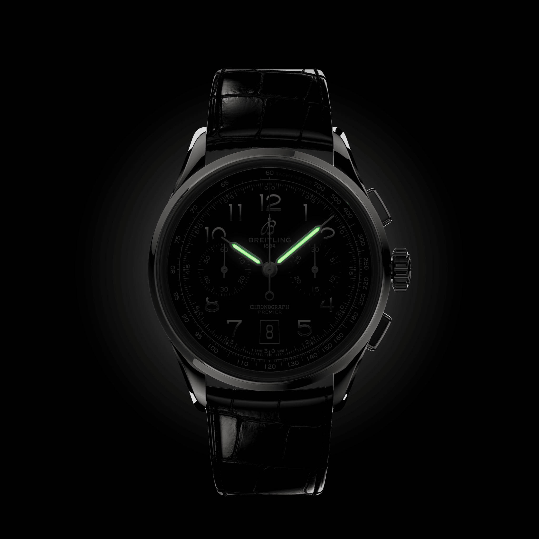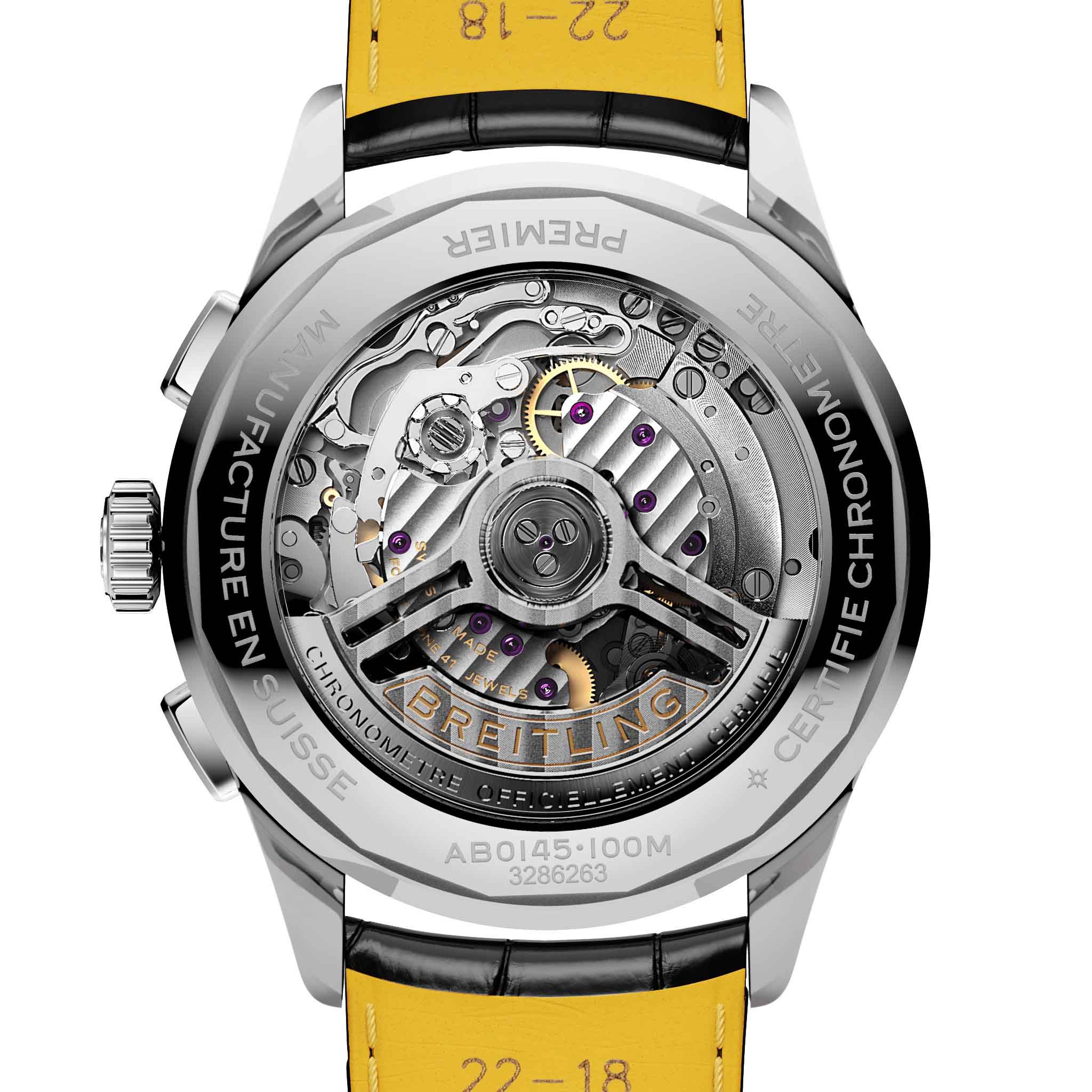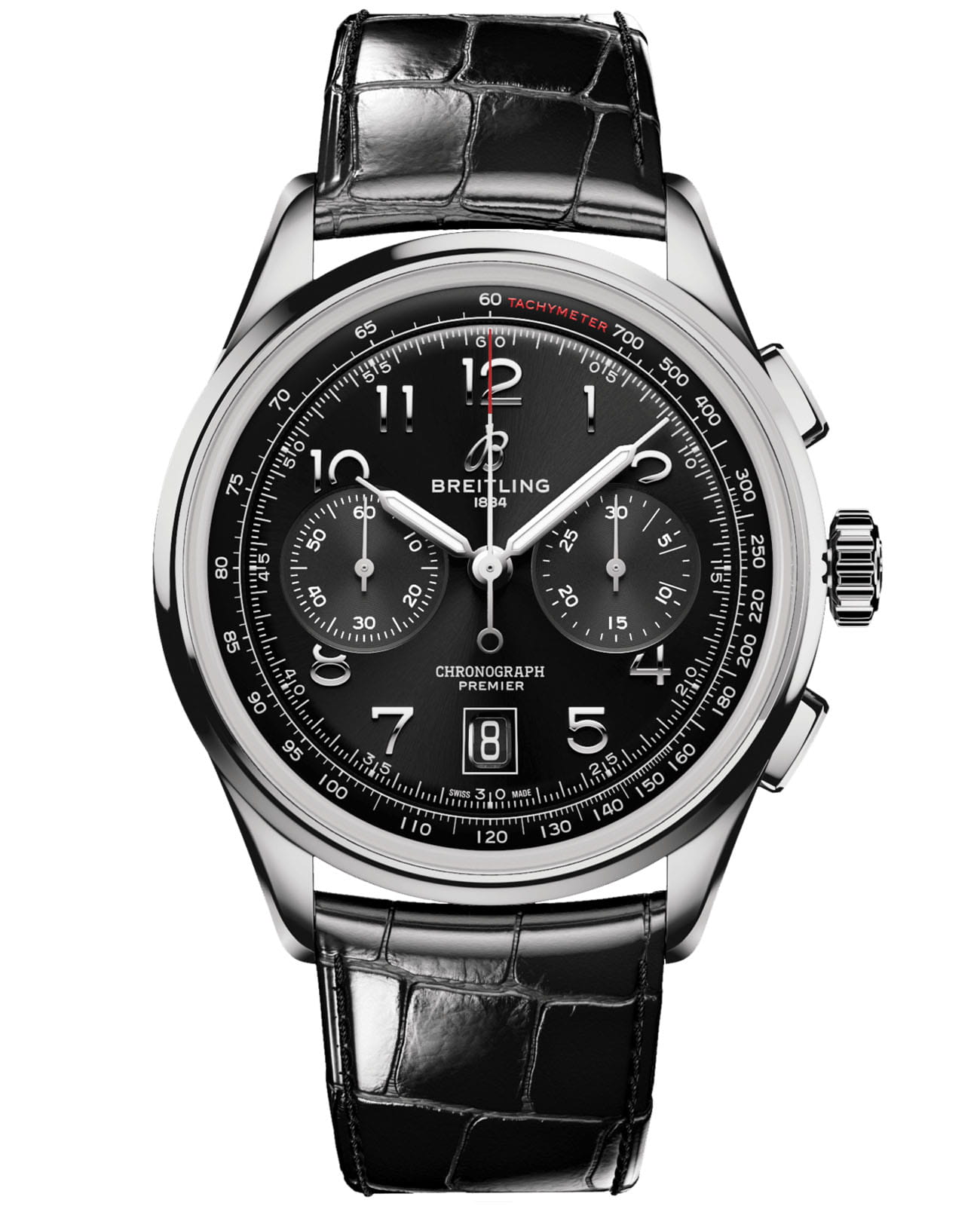 Мужские швейцарские часы-хронографХронографФункция позволяет измерять отрезки времени с особой точностью: часы, минуты, секунды. Верным признаком хронографа является наличие на циферблате 3 дополнительных окошек-счётчиков. с тахиметромТахиметрРазмеченная шкала, располагается на ободке или безеле часов. Тахиметр позволяет рассчитать скорость на определённом участке пути, расстояние измеряется в километрах или милях. Breitling Premier B01 Chronograph 42 AB0145221B1P1, механический механизм (автоматический калибр) с высокой точностью. Сапфировое стеклоСапфировое стеклоПрочный и надёжный материал из кристалла сапфира синтетического происхождения, характеризующийся особой твёрдостью и устойчивостью к царапинам и повреждениям. с антибликовым покрытием устойчивое к появлению царапин, обладающее высокой прозрачностью. Класс водозащиты: 100 метров, позволит плавать, нырять и заниматься другими водными видами спорта. Корпус часов изготовлен из стали. Кожаный крокодиловый ремешок с раскладной застёжкойРаскладная застёжкаТакой тип застёжки используется только на браслетах из металла. Она никогда не раскрывается полностью, происходит разделение на 2 и более частей. Раскладывающая застёжка снизит вероятность потери часов к минимуму.. Стрелки с люминесцентным покрытиемЛюминесцентное покрытиеПозволяет считывать показания времени в темноте. Производители наносят на стрелки, часовые индексы, безель или поверхность циферблата светонакопительный состав, дающий холодное свечение.. Окошко даты находится в положении 6 часов. СекундомерСекундомерСекундоме́р — прибор, способный измерять интервалы времени с точностью до долей секунды..