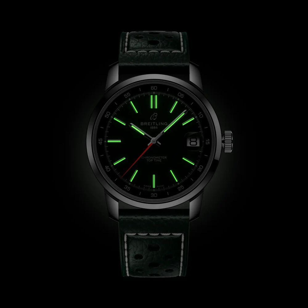 Breitling Top Time B31 AB3113171L1X1 — стильная новинка 2025 года с характерной винтажной эстетикой и современным механизмом собственного производства. Корпус диаметром 38 мм выполнен из нержавеющей стали с полированной отделкой. Прозрачная задняя крышка позволяет наблюдать за работой механизма. Циферблат защищён выпуклым сапфировым стекломСапфировое стеклоПрочный и надёжный материал из кристалла сапфира синтетического происхождения, характеризующийся особой твёрдостью и устойчивостью к царапинам и повреждениям. с двухсторонним антибликовым покрытиемАнтибликовое покрытиеСлой оксида металла в 0,13-0,3 микрон, благодаря которому стекло часов не бликует и не отражает свет. Антибликовое покрытие уменьшает отражение света в 10 раз, обеспечивая отличную читаемость показателей циферблата.. Зелёный циферблат с контрастным внутренним кольцом и яркой оранжевой секундной стрелкой оформлен в узнаваемом стиле коллекции Top Time. Стрелки и часовые метки имеют люминесцентное покрытиеЛюминесцентное покрытиеПозволяет считывать показания времени в темноте. Производители наносят на стрелки, часовые индексы, безель или поверхность циферблата светонакопительный состав, дающий холодное свечение., обеспечивающее отличную читаемость. Внутри установлен автоматический калибр Breitling B31, отображающий часы, минуты, малую секунду и дату. Механизм обеспечивает запас хода до 78 часов и работает с частотой 28 800 полуколебаний в час. Часы укомплектованы перфорированным кожаным ремешком зелёного цвета с классической застёжкой-пряжкой. Водонепроницаемость 100 метров делает модель универсальной для повседневного использования. Top Time B31 AB3113171L1X1 — гармония винтажного дизайна и инновационного часового мастерства.