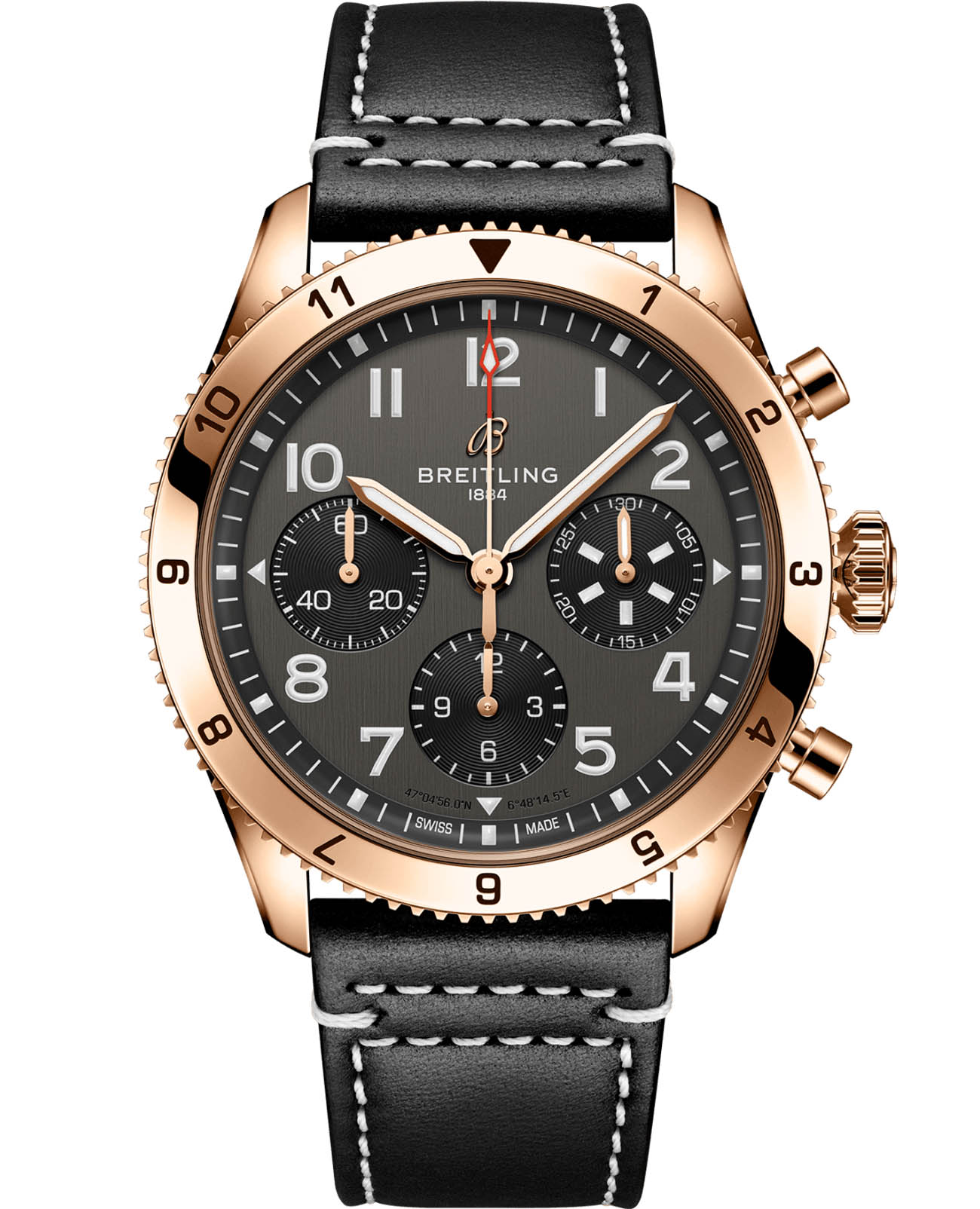 Чёрный ремешок из телячьей кожи с прострочкой, вдохновлённой лётной экипировкой, дополнен раскладной застёжкойРаскладная застёжкаТакой тип застёжки используется только на браслетах из металла. Она никогда не раскрывается полностью, происходит разделение на 2 и более частей. Раскладывающая застёжка снизит вероятность потери часов к минимуму. из 18-каратного красного золота18-каратное золотоОбозначение по каратной системе пробирования, оно показывает, сколько драгоценного металла содержится в изделии. 18 карат - в составе 75% чистого золота, соответствует 750 пробе.