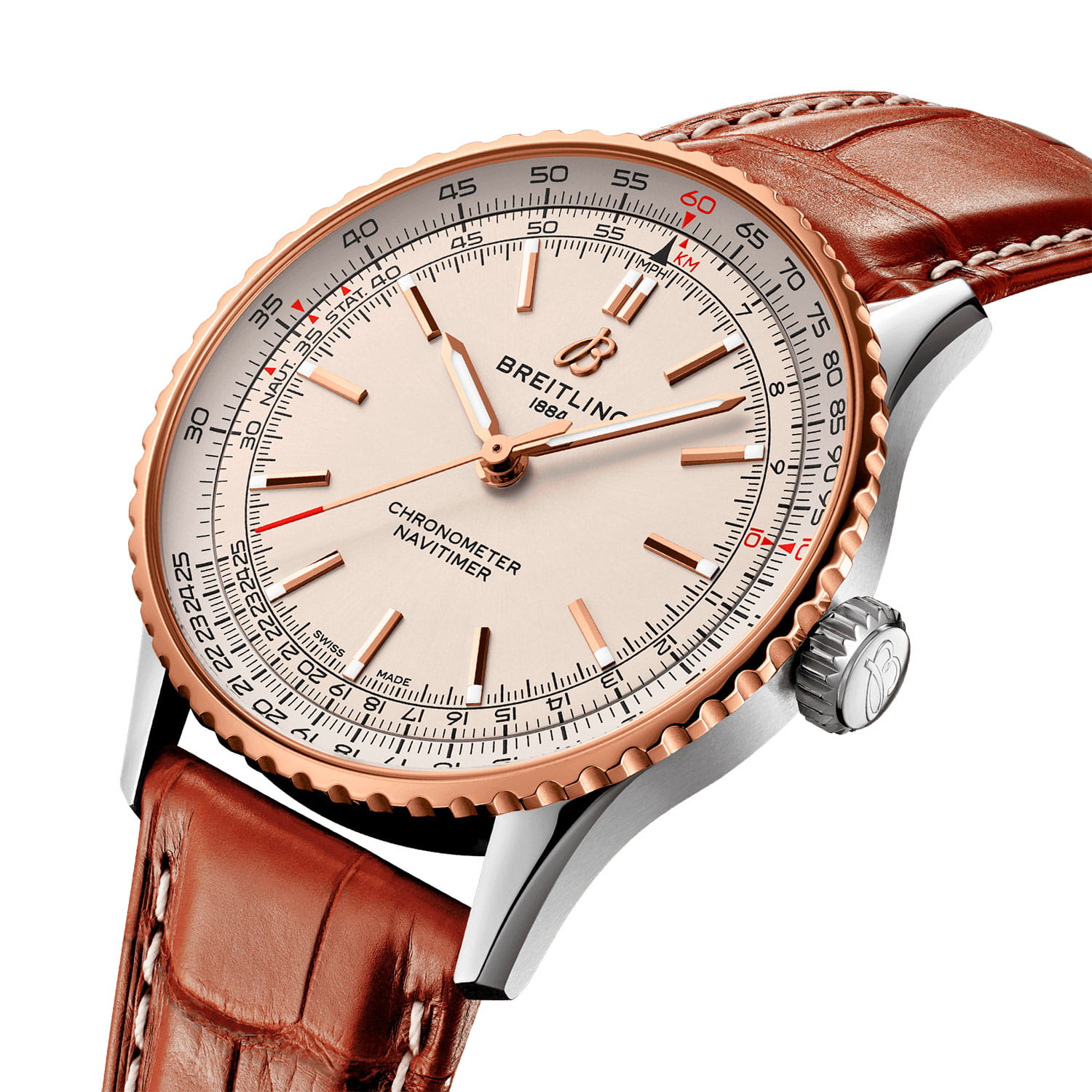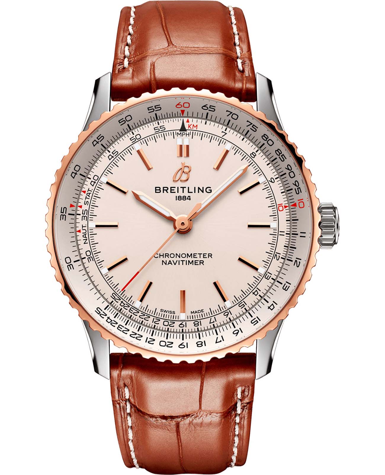 Мужские швейцарские часы с секундомеромСекундомерСекундоме́р — прибор, способный измерять интервалы времени с точностью до долей секунды. Breitling Navitimer Chronograph 43 U17329F41G1P1, механический механизм (автоматический калибр) с высокой точностью. Сапфировое стеклоСапфировое стеклоПрочный и надёжный материал из кристалла сапфира синтетического происхождения, характеризующийся особой твёрдостью и устойчивостью к царапинам и повреждениям. с антибликовым покрытием устойчивое к появлению царапин, обладающее высокой прозрачностью. Класс водозащиты: 30 метров, позволит защитить корпус от случайных брызг или капель дождя. Корпус часов изготовлен из стали. Чередующиеся полированные и матовые металлические элементы создают блестящую, но в то же время сдержанную отделку. Кожаный ремешок с раскладной застёжкойРаскладная застёжкаТакой тип застёжки используется только на браслетах из металла. Она никогда не раскрывается полностью, происходит разделение на 2 и более частей. Раскладывающая застёжка снизит вероятность потери часов к минимуму.. С момента своего дебюта 70 лет назад icon от Breitling претерпел множество модификаций, но этот новый Navitimer отражает его самые классические функции, дополняя их современными усовершенствованиями. Сплющенная логарифмическая линейка и выпуклый кристалл создают иллюзию более изящного профиля. Шкала тахиметраТахиметрРазмеченная шкала, располагается на ободке или безеле часов. Тахиметр позволяет рассчитать скорость на определённом участке пути, расстояние измеряется в километрах или милях. на циферблате. Часы имеют сертификат COSCСертификат COSCОфициальный сертификат, подтверждающий то, что часы ходят с особо высокой точностью. Для получения документа часы подвергаются тестовым испытаниям, разработанным швейцарским институтом тестирования хронометров COSC. Допустимая норма для механических часов -4/+6 секунд в день, для кварцевых моделей +/- 0,07 секунд в день.. Стрелки и метки с люминесцентным покрытиемЛюминесцентное покрытиеПозволяет считывать показания времени в темноте. Производители наносят на стрелки, часовые индексы, безель или поверхность циферблата светонакопительный состав, дающий холодное свечение.. И если есть одно обновление, которое наверняка вызовет ностальгию, так это возвращение крыльев AOPA в исходное положение на 12 часов. Вот уже 70 лет оригинальные часы Breitling pilot в равной степени нравятся как авиаторам, так и ценителям вкуса. Это самые культовые часы Breitling, которые носят астронавты в космосе и крупнейшие звезды на земле, и одни из самых узнаваемых часов всех времен.
