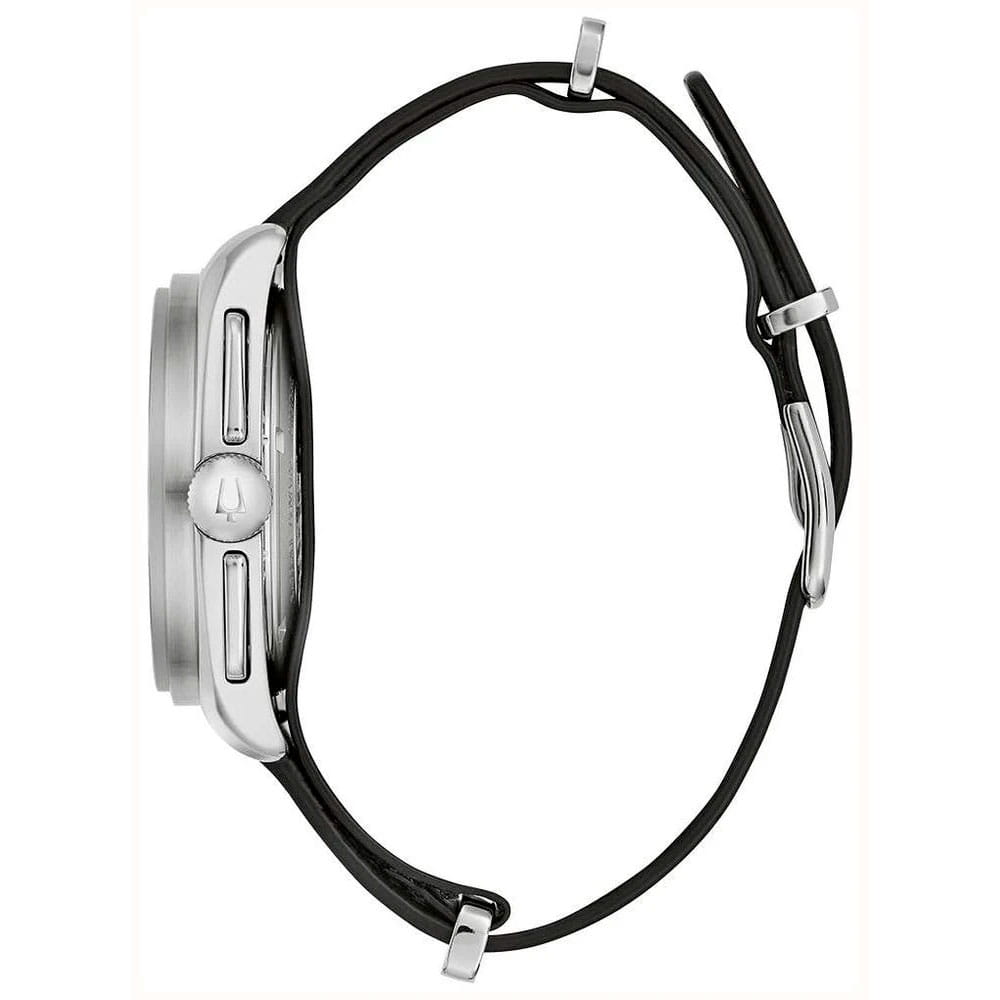 Мужские кварцевые часы-хронографХронографФункция позволяет измерять отрезки времени с особой точностью: часы, минуты, секунды. Верным признаком хронографа является наличие на циферблате 3 дополнительных окошек-счётчиков. Bulova Lunar Pilot Chronograph 96K115 – отражающий идеальное сочетание современного дизайна, надёжности и функциональности. Элегантный облик станет превосходным завершением образа, наделив его индивидуальным характером. Корпус из нержавеющей стали серебристого цвета, диаметром  43.5 мм идеально сбалансирован и элегантен. Сапфировое стеклоСапфировое стеклоПрочный и надёжный материал из кристалла сапфира синтетического происхождения, характеризующийся особой твёрдостью и устойчивостью к царапинам и повреждениям. защищает циферблат от царапин и устойчивое к мелким механическим повреждениям. Стальной браслет на застёжке-бабочке с кнопкамиЗастёжка "бабочка"Такой вид застёжки дополняется предохранителями, помогающими избежать случайного раскрытия браслета. Обладают изящным исполнением. обеспечивает комфортное ношение. Водозащита 50 метров позволит защитить корпус от случайных брызг или капель дождя. Шкала тахиметраТахиметрРазмеченная шкала, располагается на ободке или безеле часов. Тахиметр позволяет рассчитать скорость на определённом участке пути, расстояние измеряется в километрах или милях. на внешнем кольце циферблата. Стрелки и метки с люминесцентным покрытиемЛюминесцентное покрытиеПозволяет считывать показания времени в темноте. Производители наносят на стрелки, часовые индексы, безель или поверхность циферблата светонакопительный состав, дающий холодное свечение. позволяющие легко определять время даже в темноте.Эта модель – отличный выбор для тех, кто ищет сочетание стиля, качества и функциональности. Часы станут не только полезным аксессуаром, но и выразительным элементом вашего имиджа. В комплекте кожаный ремешок.