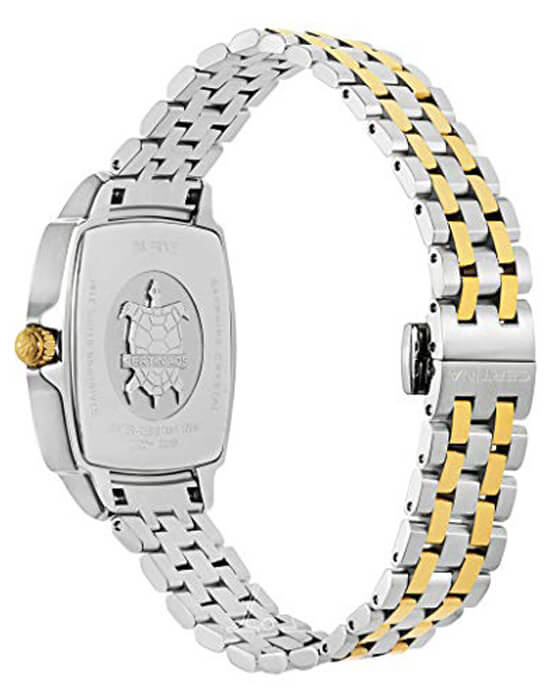 Квадратный перламутровый циферблат декорирован 3 сияющими бриллиантами на метке 12. Швейцарский кварцевый механизм ETA F06.411 Precidrive™Precidrive™Инновационный кварцевый механизм Certina. Часы, оснащённые этим швейцарским калибром, приравниваются к точности к сертифицированным хронометрам, точность хода составляет +/-10 секунд в год. помогает измерять время с высокой точностью. Корпус и браслет из нержавеющей стали 316L с золотистым PVD-покрытиемPVDУльтратонкое покрытие наносится в технике вакуумного напыления, сочетает в себе нитрид титана особой прочности со слоем золота или оксида хрома. Несёт в себе декоративную или защитную функцию..