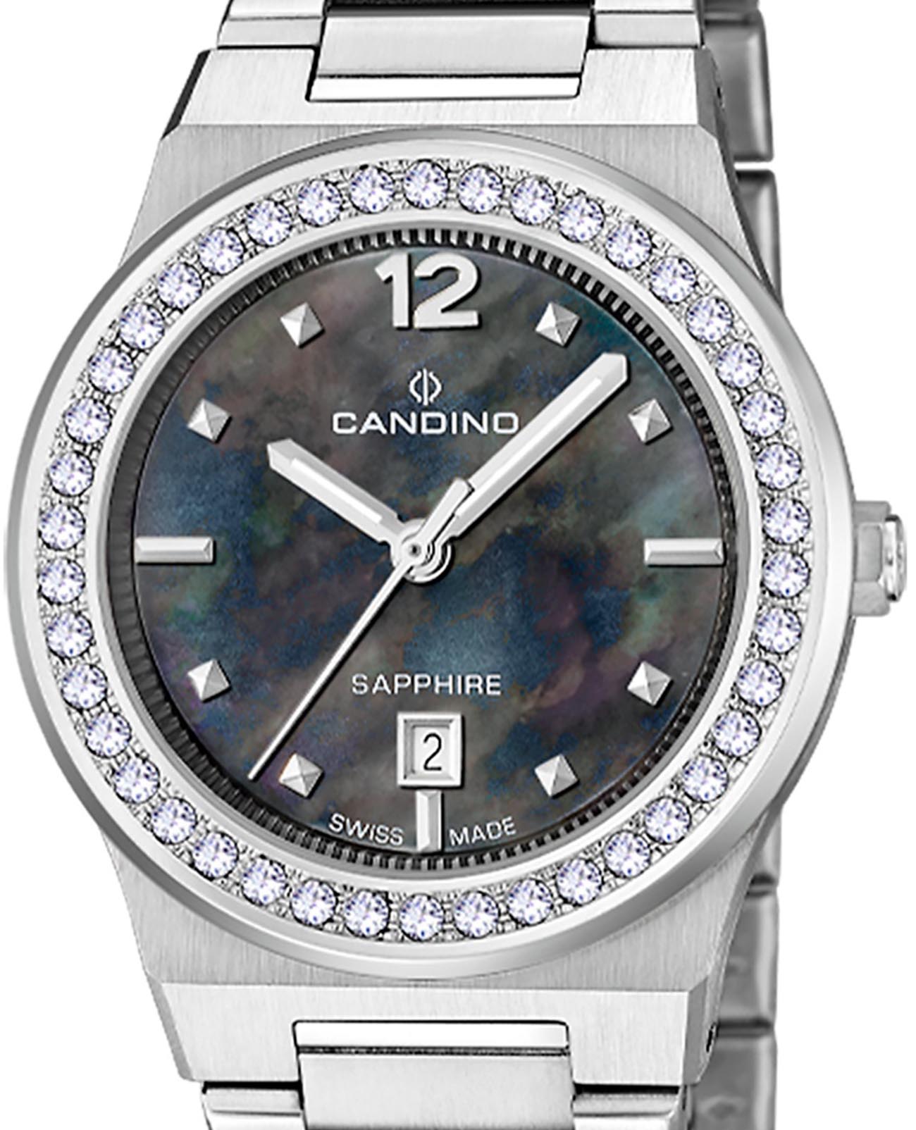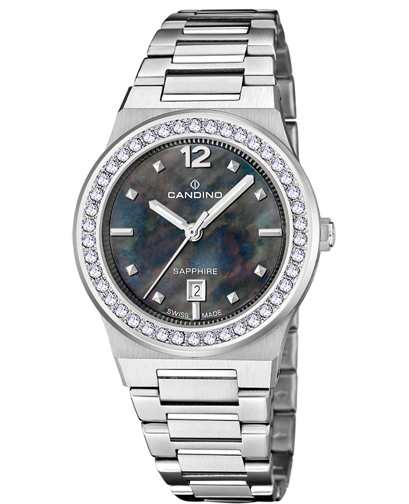 Женские кварцевые часы Candino — это элегантный аксессуар швейцарского производства, сочетающий изысканный дизайн и надёжность. Корпус круглой формы выполнен из стали серебряного цвета и защищён сапфировым стекломСапфировое стеклоПрочный и надёжный материал из кристалла сапфира синтетического происхождения, характеризующийся особой твёрдостью и устойчивостью к царапинам и повреждениям.. Безель украшен кристаллами, подчёркивая роскошь модели. Циферблат оформлен точками в качестве индикации, окошко даты расположено на отметке 6 часов. Стрелки и метки оснащены люминесцентным покрытиемЛюминесцентное покрытиеПозволяет считывать показания времени в темноте. Производители наносят на стрелки, часовые индексы, безель или поверхность циферблата светонакопительный состав, дающий холодное свечение. Luminova, обеспечивающим хорошую читаемость в темноте. Браслет из стали серебряного цвета фиксируется на раскладной застёжкеРаскладная застёжкаТакой тип застёжки используется только на браслетах из металла. Она никогда не раскрывается полностью, происходит разделение на 2 и более частей. Раскладывающая застёжка снизит вероятность потери часов к минимуму.. Водонепроницаемость составляет 50 WR, что позволяет использовать часы в повседневных условиях, защищая от случайных брызг и капель дождя. Модель идеально подходит для повседневного ношения, подчёркивая утончённый стиль и женственность.