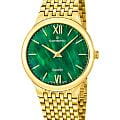 Мужские кварцевые часы Candino из коллекции Series 1947 — это сочетание минимализма, швейцарского качества и современного дизайна. Корпус диаметром 39 мм и толщиной 6 мм выполнен из нержавеющей стали 316L с PVD-покрытиемPVDУльтратонкое покрытие наносится в технике вакуумного напыления, сочетает в себе нитрид титана особой прочности со слоем золота или оксида хрома. Несёт в себе декоративную или защитную функцию. жёлтого золота. Циферблат зелёного цвета оформлен двумя стрелками без индикации даты, что придаёт дизайну чистоту и элегантность. Циферблат защищён сапфировым стекломСапфировое стеклоПрочный и надёжный материал из кристалла сапфира синтетического происхождения, характеризующийся особой твёрдостью и устойчивостью к царапинам и повреждениям., устойчивым к царапинам. Механизм — кварцевый произведённый в Швейцарии. Часы оснащены стальным браслетом с PVD-покрытиемPVDУльтратонкое покрытие наносится в технике вакуумного напыления, сочетает в себе нитрид титана особой прочности со слоем золота или оксида хрома. Несёт в себе декоративную или защитную функцию. жёлтого золота на застёжке «бабочка» с кнопкамиЗастёжка "бабочка"Такой вид застёжки дополняется предохранителями, помогающими избежать случайного раскрытия браслета. Обладают изящным исполнением. . Водонепроницаемость 50 м позволяет использовать часы в повседневных условиях. Гарантия — 2 года. Идеальный выбор для тех, кто ценит лаконичный стиль, точность и надёжность.
