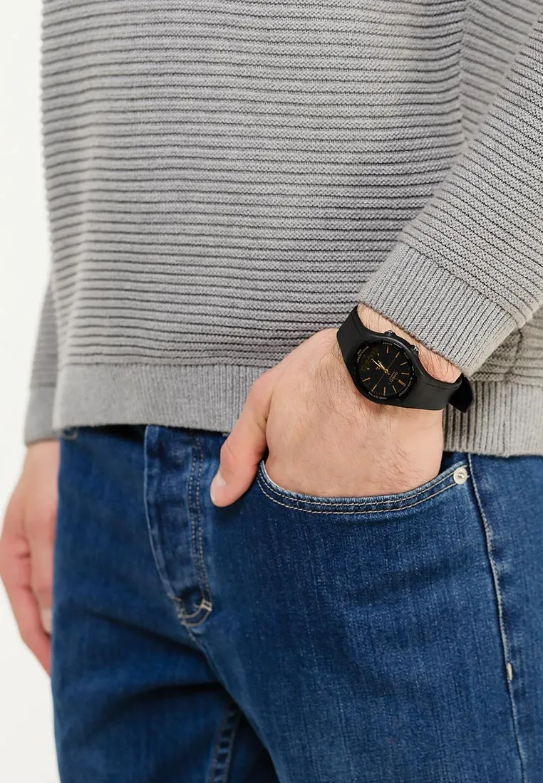 В изготовлении использованы современные полимерные материалы. Время отображается в 12- и 24-часовом форматах. СекундомерСекундомерСекундоме́р — прибор, способный измерять интервалы времени с точностью до долей секунды. измеряет прошедшее время с точностью в 1/100 секунды. Водонепроницаемость в 50 WR. Стрелки с люминесцентным покрытиемЛюминесцентное покрытиеПозволяет считывать показания времени в темноте. Производители наносят на стрелки, часовые индексы, безель или поверхность циферблата светонакопительный состав, дающий холодное свечение.. Пластиковый ремешок на стандартной застёжке.