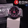 Розовые элементы гармонируют с контрастным чёрным циферблатом, прослеживается дизайн в уличном стиле. Привлекательно смотрятся оригинальные стрелки. Противоударный корпусУдаропрочный корпусМеханизм заключён в корпус, выполненный из современных материалов, устойчивых к ударам, механическим повреждениям и падению с высоты: инновационный пластик, карбон, нержавеющая сталь, титан. защищает японский кварцевый калибр от последствий падения, ударов, вибрации. Механизм работает от батарейки, рассчитанной на 2-летний срок. Закаленное минеральное стекло. Светодиодная подсветкаСветодиодная подсветкаСветодиодная или LED-подсветка обеспечивает появление яркого холодного свечения за счёт LED-элементов - маленьких лампочек. Они потребляют минимальное количество энергии, чаще всего можно встретить 1 светодиод, в нижней части циферблата. циферблата. Водостойкость 100 метров. Полимерный ремешок в качестве амортизатора. Будильник, мировое времяМировое время Полезное часовое усложнение, отображающее время в основных городах и известных областях по всему миру, оно связано с часовыми поясами, удобно для путешественников и бизнесменов. , таймер, хронографХронографФункция позволяет измерять отрезки времени с особой точностью: часы, минуты, секунды. Верным признаком хронографа является наличие на циферблате 3 дополнительных окошек-счётчиков., секундомер, вечный календарьВечный календарьКлассическое часовое усложнение, представляющее собой календарь, рассчитанный на несколько лет вперёд (стандартно – до 2099 года). Определяет текущую дату, день недели, месяц.. Габариты: 46,3 x 43,4 x 15,8 мм.