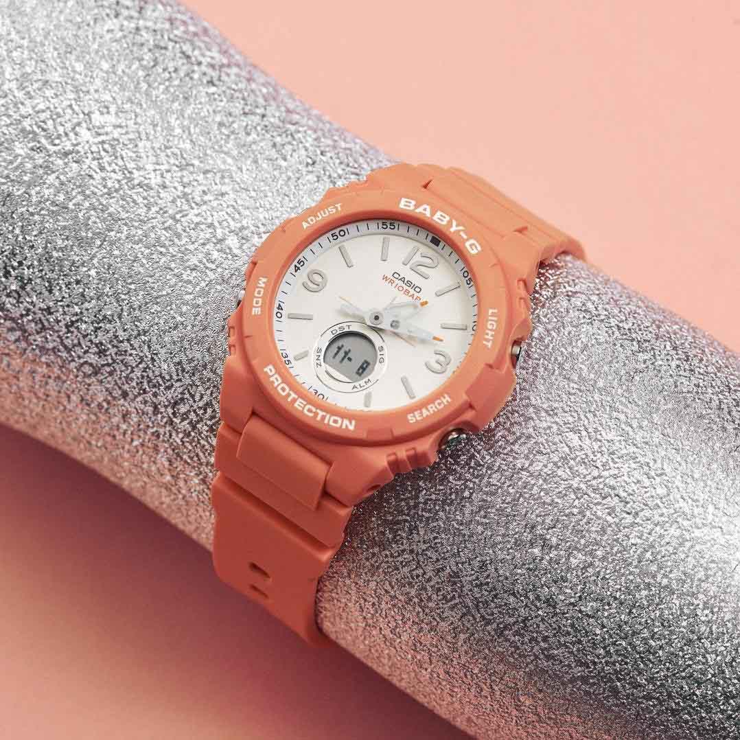 Модель из коллекции Baby-G представлена в оранжевом исполнении, солнечный оттенок акцентирует внимание на жизнерадостной натуре своего владельца. Женские японские наручные часы с противоударным корпусом Casio Baby-G BGA-260-4A, кварцевый механизм с высокой точностью. Класс водозащиты: 100 метров, позволит плавать, нырять и заниматься другими водными видами спорта. Корпус часов изготовлен из пластика. Ударопрочный корпусУдаропрочный корпусМеханизм заключён в корпус, выполненный из современных материалов, устойчивых к ударам, механическим повреждениям и падению с высоты: инновационный пластик, карбон, нержавеющая сталь, титан. защищает механизм от ударов и вибрации. Минималистичный циферблат дополнен стрелками необычной формы с яркими наконечниками, они имеют люминесцентное покрытиеЛюминесцентное покрытиеПозволяет считывать показания времени в темноте. Производители наносят на стрелки, часовые индексы, безель или поверхность циферблата светонакопительный состав, дающий холодное свечение. для лучшей считываемости показателей времени в темноте. Гибкий полимерный ремешок красиво смотрится в сочетании со спортивным или повседневным стилем. Светодиодная подсветкаСветодиодная подсветкаСветодиодная или LED-подсветка обеспечивает появление яркого холодного свечения за счёт LED-элементов - маленьких лампочек. Они потребляют минимальное количество энергии, чаще всего можно встретить 1 светодиод, в нижней части циферблата. дисплея. Цвет подсветки: белый. Подсветка NeobriteПодсветка NeobriteИспользование светонакопительных составов на основе сульфида цинка или алюмината стронция, яркий свет можно наблюдать на протяжении 6-10 часов после «зарядки» часов около источника света. обеспечивает длительное послесвечение в темноте даже после кратковременного нахождения на свету. Мировое времяМировое время Полезное часовое усложнение, отображающее время в основных городах и известных областях по всему миру, оно связано с часовыми поясами, удобно для путешественников и бизнесменов. – 27 городов (29 часовых поясов), всемирное координированное время (UTCUTCВсемирное кординационное время, не имеющее привязки к географическому положению Гринвича, основывается на атомном отсчёте времени. Регулировка времени осуществляется более точно, чем устаревшее GMT.