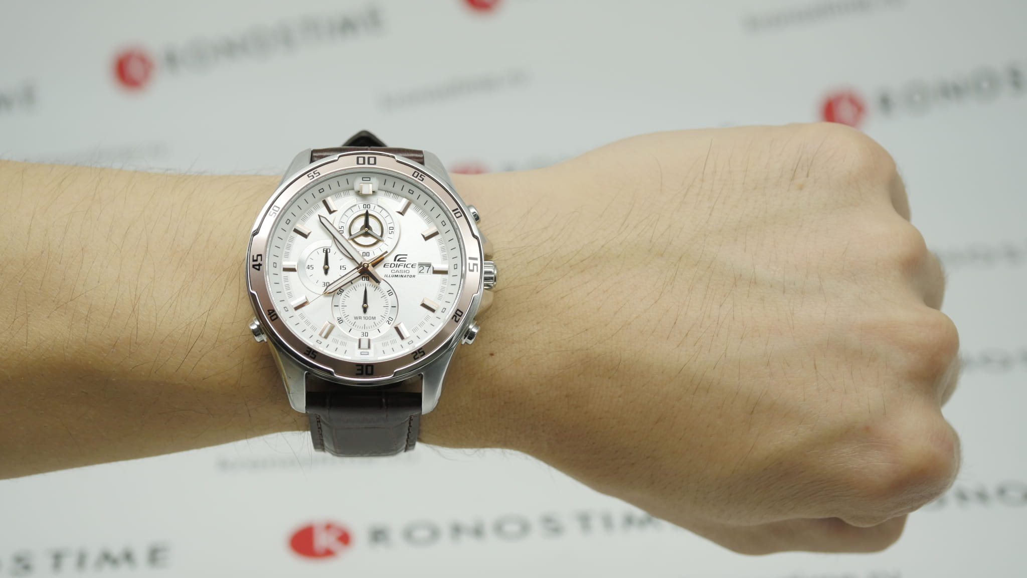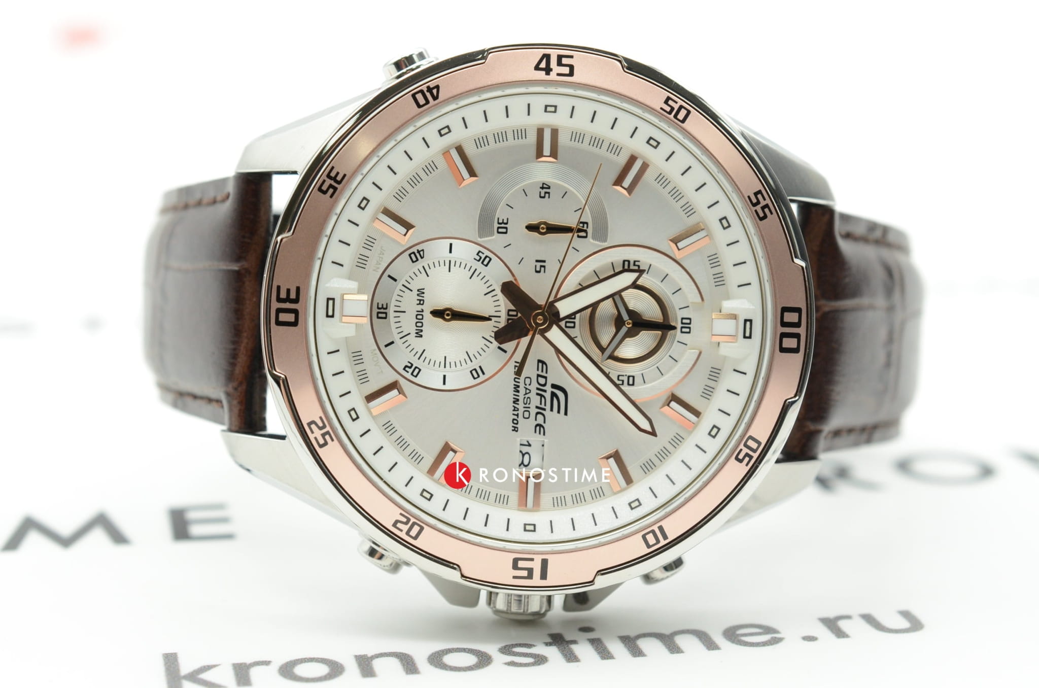 Практичный и надёжный аксессуар стильно смотрится на запястье и подходит к любой одежде. Светлый циферблат дополнен контрастными стрелками, часовыми метками и счётчиками, что обеспечивает идеальную читаемость показателей. Особую привлекательность представляет собой безельБезельВнешний ободок, закрепляющий стекло. В спортивных часах так называется поворотное кольцо с делениями на циферблате, выполняет роль таймера – замеряет отрезки времени на шкале. Неподвижный безель – элемент декора. Однонаправленно вращающийся безель на дайверских часах позволяет фиксировать моменты погружения и выныривания на поверхность. цвета розового золота. Высокоточный кварцевый механизм Miyota с точностью хода +/- 15 сек/мес. Коричневый ремешок из натуральной кожи. Закаленное минеральное стекло. Люминесцентная подсветкаЛюминесцентное покрытиеПозволяет считывать показания времени в темноте. Производители наносят на стрелки, часовые индексы, безель или поверхность циферблата светонакопительный состав, дающий холодное свечение.. Водонепроницаемость до 100 метров. Отображение даты, секундомер. Габариты: 47,2 x 54 x 13,9 мм.