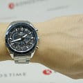 Аксессуар с автомобильным характером имеет ударопрочный корпусУдаропрочный корпусМеханизм заключён в корпус, выполненный из современных материалов, устойчивых к ударам, механическим повреждениям и падению с высоты: инновационный пластик, карбон, нержавеющая сталь, титан. из нержавеющей стали 316L, необычно смотрятся угловатые грани. На чёрном циферблате с ярко-синими акцентами располагается множество окошек и счётчиков, но это не добавляет перегруженности. Японский кварцевый механизм с высокой точностью хода приводится в работу за счёт батарейки, рассчитанной на 3 года. БезельБезельВнешний ободок, закрепляющий стекло. В спортивных часах так называется поворотное кольцо с делениями на циферблате, выполняет роль таймера – замеряет отрезки времени на шкале. Неподвижный безель – элемент декора. Однонаправленно вращающийся безель на дайверских часах позволяет фиксировать моменты погружения и выныривания на поверхность. с синим IP-покрытиемIP-покрытиеМетод ионного напыления. Демонстрирует повышенную устойчивость к истиранию, окислению и химическим веществам. Под воздействием высокого давления и температуры около 1500°C молекулы металла надёжно соединяются с частицами корпуса часов.. Надёжный стальной браслет. Водостойкость 10 бар. Завинчивающаяся задняя крышка. Минеральное стекло. Крупная индикация даты, хронографХронографФункция позволяет измерять отрезки времени с особой точностью: часы, минуты, секунды. Верным признаком хронографа является наличие на циферблате 3 дополнительных окошек-счётчиков., секундомер. Габариты: 44,6 x 50 x 12,4 мм.