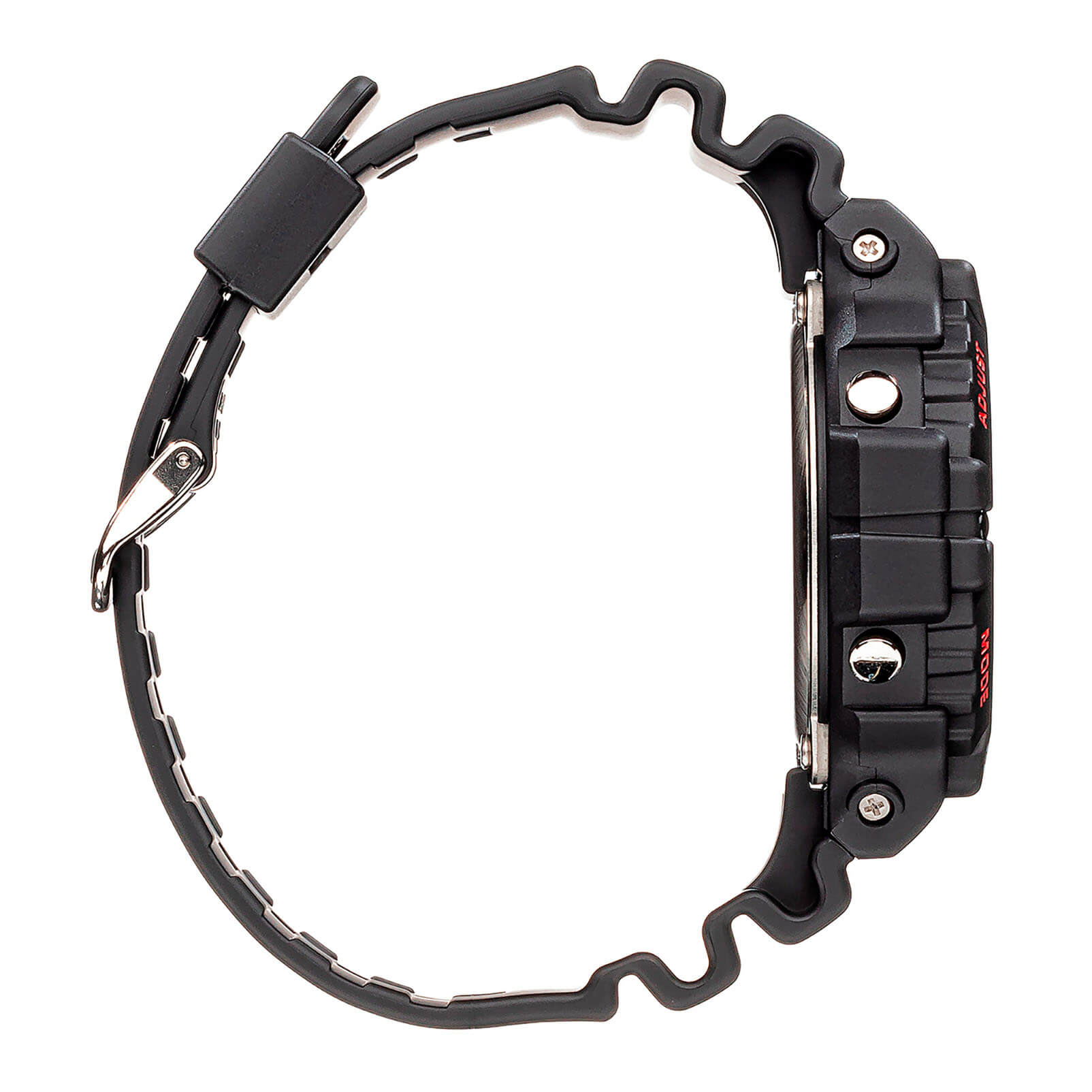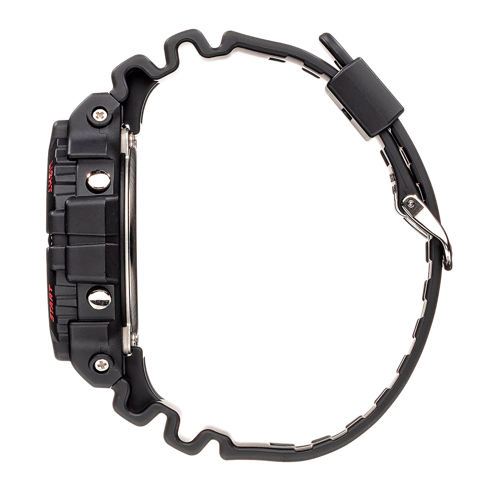 Внешний вид часов с чёрным полимерным ремешком остался прежним, изменения коснулись лишь материалов и дополнительных функциональных особенностей. Внимание притягивает необычный циферблат с тремя функциональными окошками над основным дисплеем. Тёмная расцветка разбавлена элементами голубого, красного и белого цвета. Кварцевый механизм японского производства получает питание от батарейки, срок которой рассчитан на 5 лет. Ударопрочный корпусУдаропрочный корпусМеханизм заключён в корпус, выполненный из современных материалов, устойчивых к ударам, механическим повреждениям и падению с высоты: инновационный пластик, карбон, нержавеющая сталь, титан. из полимерного пластика, устойчивый к большим нагрузкам. Минеральное стеклоМинеральное стеклоМинеральное стекло представляет собой искусственно выращенный минерал кварца. Такое стекло отличается особой устойчивостью к повреждениям и царапинам. Уступает по некоторым качествам сапфировому стеклу.. Водостойкость 200 метров. Электролюминесцентная подсветкаЭлектролюминесцентная подсветкаЭлектролюминесцентная панель устанавливается под ЖК-экраном часов, при нажатии кнопки электричество преобразуется в свет за счёт подачи напряжения на атомы фосфора, такой тип подсветки позволяет освещать весь циферблат. циферблата. СекундомерСекундомерСекундоме́р — прибор, способный измерять интервалы времени с точностью до долей секунды., хронографХронографФункция позволяет измерять отрезки времени с особой точностью: часы, минуты, секунды. Верным признаком хронографа является наличие на циферблате 3 дополнительных окошек-счётчиков., таймерТаймерОтсчитывает секунды в обратном направлении в заданном интервале времени. обратного отсчёта с автоповтором, мировое времяМировое время Полезное часовое усложнение, отображающее время в основных городах и известных областях по всему миру, оно связано с часовыми поясами, удобно для путешественников и бизнесменов. , 5 будильниковБудильникБуди́льник — часы, в заданный момент времени подающие звуковой, световой и/или в редких случаях другой сигнал., автоматический календарь до 2099 года. Габариты: 51,4 x 46,8 x 15,5 мм.