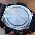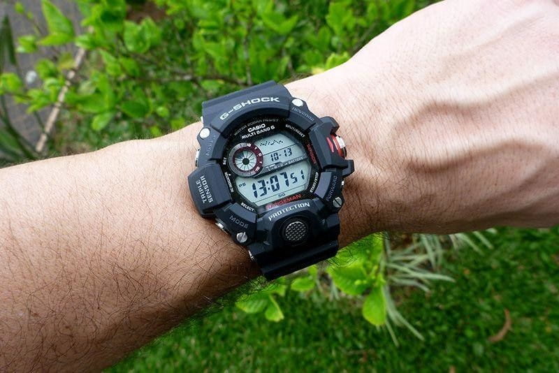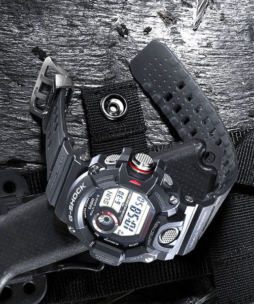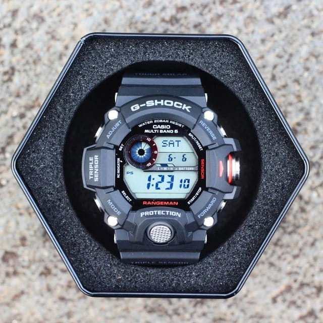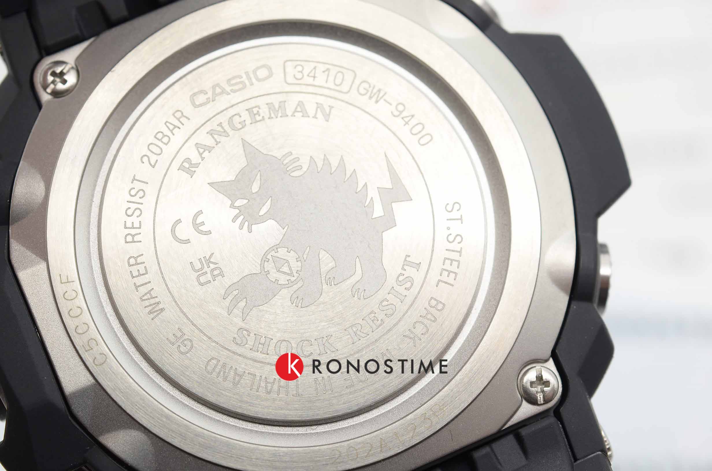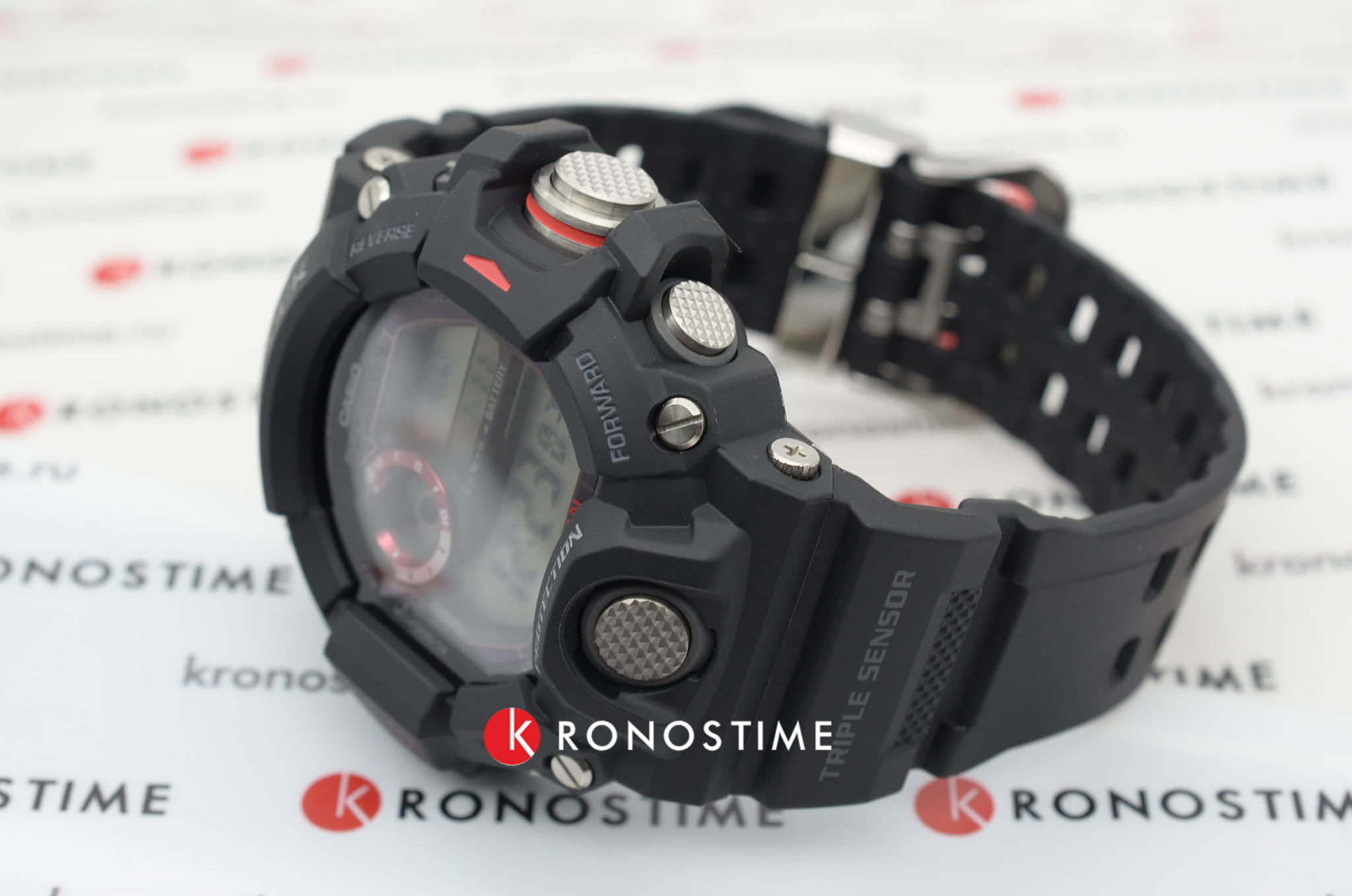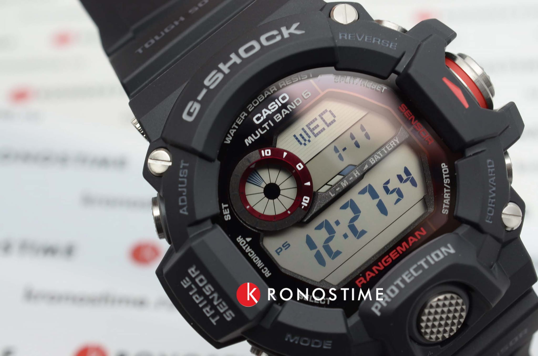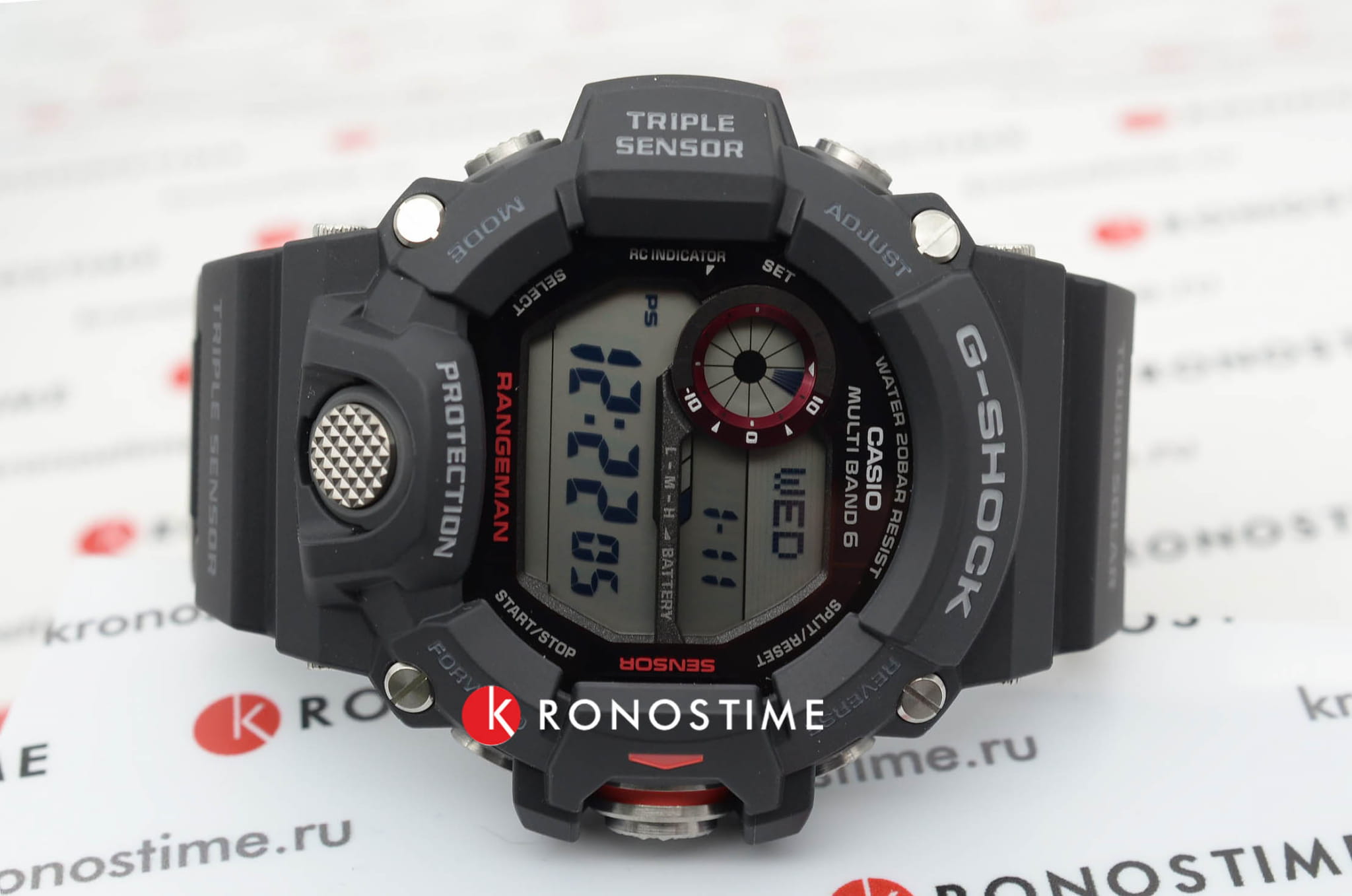 Мужские японские часы с минеральным стекломМинеральное стеклоМинеральное стекло представляет собой искусственно выращенный минерал кварца. Такое стекло отличается особой устойчивостью к повреждениям и царапинам. Уступает по некоторым качествам сапфировому стеклу. Casio G-Shock GW-9400-1E из коллекции G-Shock представляют собой многофункциональный помощник с брутальным дизайном. Модель серии Rangeman отличается стильной чёрной расцветкой с красными деталями, брендовый аксессуар с массивными элементами оформления точно станет запоминающейся деталью образа. Наручные часы оснащены различными функциями, которые по достоинству оценят любители путешествовать: отображение восхода и заката солнца, термометр -10°C /+60°C, барометр, альтиме́трАльтиме́трАльтиме́тр (или высотоме́р) – прибор для измерения высоты над уровнем моря. Необходим при ориентировании в горах, в т.ч. в условиях плохой видимости; оповещает о перепадах высот, о достижении заданной точки и т.д., таймерТаймерОтсчитывает секунды в обратном направлении в заданном интервале времени., мировое времяМировое время Полезное часовое усложнение, отображающее время в основных городах и известных областях по всему миру, оно связано с часовыми поясами, удобно для путешественников и бизнесменов. , 5 будильниковБудильникБуди́льник — часы, в заданный момент времени подающие звуковой, световой и/или в редких случаях другой сигнал., секундомерСекундомерСекундоме́р — прибор, способный измерять интервалы времени с точностью до долей секунды., цифровой компас. Японский кварцевый механизм. Технология Tough SolarTough SolarТехнология основана на подзарядке аккумулятора от источника солнечного света, специальная панель улавливает солнечные лучи и преобразует их в энергию для работы часов. Достаточно пары минут нахождения на солнце для функционирования часов в течении суток.. Индикатор уровня заряда аккумулятора. Ударопрочный корпусУдаропрочный корпусМеханизм заключён в корпус, выполненный из современных материалов, устойчивых к ударам, механическим повреждениям и падению с высоты: инновационный пластик, карбон, нержавеющая сталь, титан. из пластика. Водозащита 20 бар. Автоматическая светодиодная подсветкаСветодиодная подсветкаСветодиодная или LED-подсветка обеспечивает появление яркого холодного свечения за счёт LED-элементов - маленьких лампочек. Они потребляют минимальное количество энергии, чаще всего можно встретить 1 светодиод, в нижней части циферблата.. Габариты: 55,2 x 53,5 x 18,2 мм.