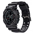 Форма ударопрочного корпусаУдаропрочный корпусМеханизм заключён в корпус, выполненный из современных материалов, устойчивых к ударам, механическим повреждениям и падению с высоты: инновационный пластик, карбон, нержавеющая сталь, титан. унаследована от моделей линейки GA-100, в обновленном варианте предстал циферблат и оригинальные стрелки. Наручные часы в тёмной расцветке и красными элементами станут прекрасным дополнением к повседневному образу, брендовая модель не имеет ни одной лишней детали. Аксессуар изготовлен из полимерного материала, благодаря его устойчивости к ударам и повреждениям часы получили максимальную надёжность. Японский кварцевый калибр с точностью хода +/- 15 секунд в месяц работает от батарейки, рассчитанной на 2 года. Автоматическая светодиодная подсветкаСветодиодная подсветкаСветодиодная или LED-подсветка обеспечивает появление яркого холодного свечения за счёт LED-элементов - маленьких лампочек. Они потребляют минимальное количество энергии, чаще всего можно встретить 1 светодиод, в нижней части циферблата.. Устойчивость к магнитным полям. Минеральное стекло. Класс водозащиты WR 200. Расчёт средней скорости пути, хронографХронографФункция позволяет измерять отрезки времени с особой точностью: часы, минуты, секунды. Верным признаком хронографа является наличие на циферблате 3 дополнительных окошек-счётчиков., автоматический календарь, секундомер, мировое времяМировое время Полезное часовое усложнение, отображающее время в основных городах и известных областях по всему миру, оно связано с часовыми поясами, удобно для путешественников и бизнесменов. , таймер, будильник. Габариты: 55 x 51,2 x 16,9 мм.