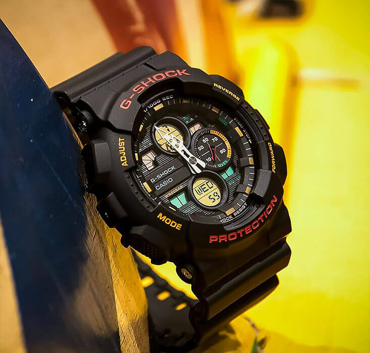 Японские мужские часы-хронографХронографФункция позволяет измерять отрезки времени с особой точностью: часы, минуты, секунды. Верным признаком хронографа является наличие на циферблате 3 дополнительных окошек-счётчиков. Casio G-Shock GA-140-1A4 из коллекции G-Shock. Минеральное стеклоМинеральное стеклоМинеральное стекло представляет собой искусственно выращенный минерал кварца. Такое стекло отличается особой устойчивостью к повреждениям и царапинам. Уступает по некоторым качествам сапфировому стеклу. устойчивое к появлению царапин, обладающее высокой прозрачностью. Ударопрочный корпусУдаропрочный корпусМеханизм заключён в корпус, выполненный из современных материалов, устойчивых к ударам, механическим повреждениям и падению с высоты: инновационный пластик, карбон, нержавеющая сталь, титан. защищает механизм от ударов и вибрации. Электролюминесцентная подсветкаЭлектролюминесцентная подсветкаЭлектролюминесцентная панель устанавливается под ЖК-экраном часов, при нажатии кнопки электричество преобразуется в свет за счёт подачи напряжения на атомы фосфора, такой тип подсветки позволяет освещать весь циферблат. освещает весь циферблат. При повороте часов в сторону лица, подсветка включается автоматически. Мировое времяМировое время Полезное часовое усложнение, отображающее время в основных городах и известных областях по всему миру, оно связано с часовыми поясами, удобно для путешественников и бизнесменов. – 48 городов (29 часовых поясов). СекундомерСекундомерСекундоме́р — прибор, способный измерять интервалы времени с точностью до долей секунды. с точностью измерения 1/100 секунды и измерением до 23 часов 59 минут 59,99 cек. ТаймерТаймерОтсчитывает секунды в обратном направлении в заданном интервале времени. обратного отсчета (диапазон времени 24 часа), автоматический календарь, 12/24 отображение времени. 5 будильниковБудильникБуди́льник — часы, в заданный момент времени подающие звуковой, световой и/или в редких случаях другой сигнал., один с функцией Snooze, ежечасный сигнал. Расчет скорости по выбранной дистанции. Класс водозащиты: 200 метров, позволит плавать, нырять и заниматься другими водными видами спорта. Ремешок из полимерного материала на стандартной застежке.