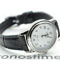 Черный ремень наручных часов сделан из натуральной, мягкой кожи. Круглый, блестящий корпус серебристого цвета сделан из гипоаллергенной латуни. На белом циферблате расположены отчетливые арабские цифры черного цвета. Прочное минеральное стекло надежно защищает часы от повреждений. Аксессуар станет красивым дополнением к любому образу и отлично подойдет как на праздничный выход, так и на каждый день.