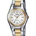 Изящные часы от Casio, сделанные в стиле casual, отлично впишутся в любой образ и будут выгодно смотреться на своем обладателе. Корпус часов сделан из гипоаллергенной латуни. На круглом циферблате расположены аккуратные временные отметки в виде арабских цифр и штрихов. На двухцветный браслет, сделанный из нержавеющей стали, нанесено защитное IP-покрытиеIP-покрытиеМетод ионного напыления. Демонстрирует повышенную устойчивость к истиранию, окислению и химическим веществам. Под воздействием высокого давления и температуры около 1500°C молекулы металла надёжно соединяются с частицами корпуса часов.. Аксессуар весит 52 грамма. Часы работают от батарейки со сроком службы 3 года.