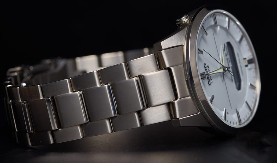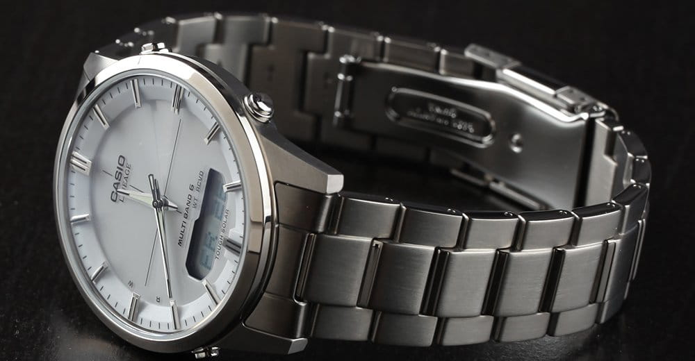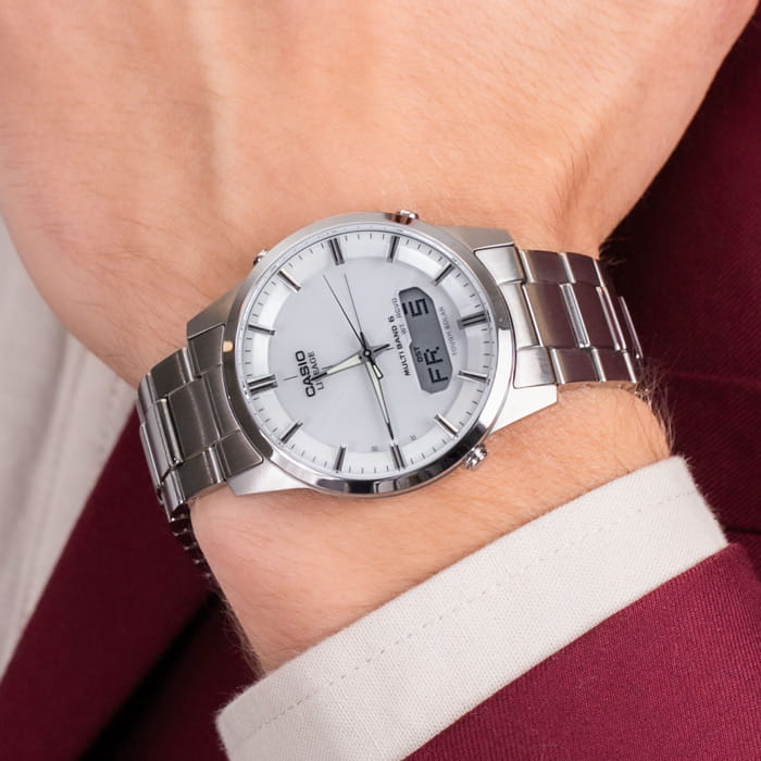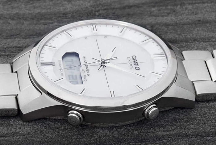 Японские титановые наручные часы c хронографомХронографФункция позволяет измерять отрезки времени с особой точностью: часы, минуты, секунды. Верным признаком хронографа является наличие на циферблате 3 дополнительных окошек-счётчиков. Casio Radio Controlled LCW-M170TD-7A, кварцевый механизм с высокой точностью. Сапфировое стекло устойчивое к появлению царапин, обладающее высокой прозрачностью. Класс водозащиты: 50 метров, позволит защитить корпус от случайных брызг или капель дождя. Корпус часов изготовлен из титана. Титановый браслет на раскладной застёжкеРаскладная застёжкаТакой тип застёжки используется только на браслетах из металла. Она никогда не раскрывается полностью, происходит разделение на 2 и более частей. Раскладывающая застёжка снизит вероятность потери часов к минимуму.. Питание от солнечной энергии, индикатор заряда батареи. Циферблат подсвечивается светодиодомСветодиодная подсветкаСветодиодная или LED-подсветка обеспечивает появление яркого холодного свечения за счёт LED-элементов - маленьких лампочек. Они потребляют минимальное количество энергии, чаще всего можно встретить 1 светодиод, в нижней части циферблата.. Подсветка NeobriteПодсветка NeobriteИспользование светонакопительных составов на основе сульфида цинка или алюмината стронция, яркий свет можно наблюдать на протяжении 6-10 часов после «зарядки» часов около источника света. обеспечивает длительное послесвечение в темноте даже после кратковременного нахождения на свету. Технология Multi Band 6 позволяет принимать сигналы от шести радиовышек, расположенных в различных точках земного шара, которые передают временные сигналы от определенных атомных часов. Коррекция текущего времени радиосигналом на территории почти всей Европы, США, Японии и Китая. СекундомерСекундомерСекундоме́р — прибор, способный измерять интервалы времени с точностью до долей секунды. с точностью показаний 1/10с и временем измерения 1ч. ТаймерТаймерОтсчитывает секунды в обратном направлении в заданном интервале времени. обратного отсчета от 1мин до 100мин. Мировое время. 12-ти и 24-х часовой формат времени. Выбор языка отображения дня недели и месяца. Функция включения/отключения звука.
