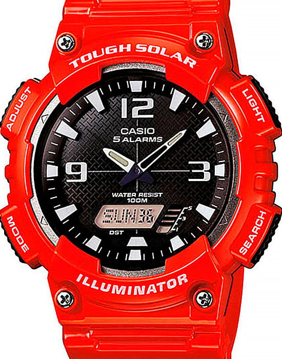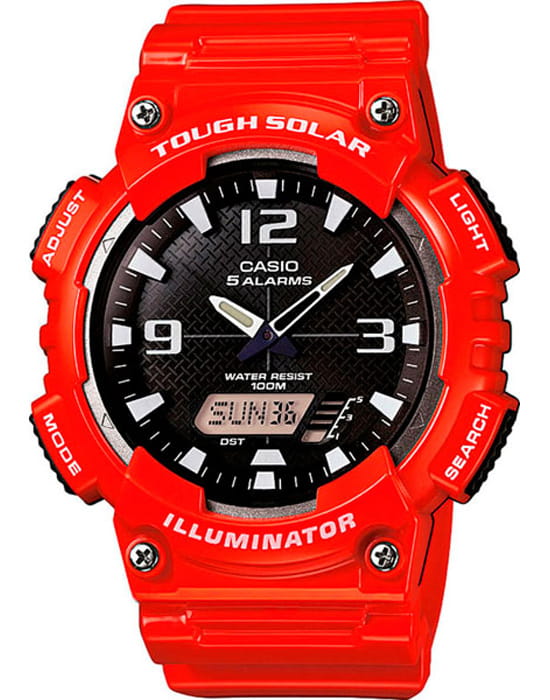 Многофункциональные и сдержанные часы в спортивном стиле станут идеальным выбором для современных мужчин. Analog-Digital Combination AQ-S810WC-4A. LCD циферблат подсвечивается светодиодной подсветкойСветодиодная подсветкаСветодиодная или LED-подсветка обеспечивает появление яркого холодного свечения за счёт LED-элементов - маленьких лампочек. Они потребляют минимальное количество энергии, чаще всего можно встретить 1 светодиод, в нижней части циферблата.. Питание от солнечной энергии, индикатор заряда батареи. Функция автоматического сохранения энергии (отключает LCD дисплей). Время работы аккумулятора без подзарядки - 10 месяцев, при включенной функции сохранения энергии - 23 месяцев. CекундомерСекундомерСекундоме́р — прибор, способный измерять интервалы времени с точностью до долей секунды. с точностью показаний 1/100с и временем измерения 1ч. Два таймераТаймерОтсчитывает секунды в обратном направлении в заданном интервале времени. обратного отсчета времени от 5с до 100 мин с устанавливаемым количеством повторов от 1 до 10. Мировое времяМировое время Полезное часовое усложнение, отображающее время в основных городах и известных областях по всему миру, оно связано с часовыми поясами, удобно для путешественников и бизнесменов. . 12-ти и 24-х часовой формат времени. Шесть языков отображения дня недели: английский, португальский, испанский, французский, немецкий и итальянский. Функция включения/отключения звука. Класс водозащиты: 100 метров, позволит плавать, нырять и заниматься другими водными видами спорта. Пластиковый ремешок на стандартной застёжке.