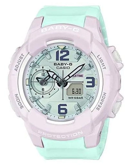 Женские противоударные японские наручные часы Casio Baby-G BGA-230PC-6B, кварцевый механизм с высокой точностью. Класс водозащиты: 100 метров, позволит плавать, нырять и заниматься другими водными видами спорта. Корпус часов изготовлен из пластика, цвета.