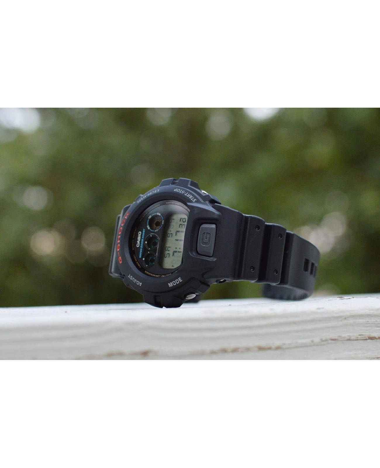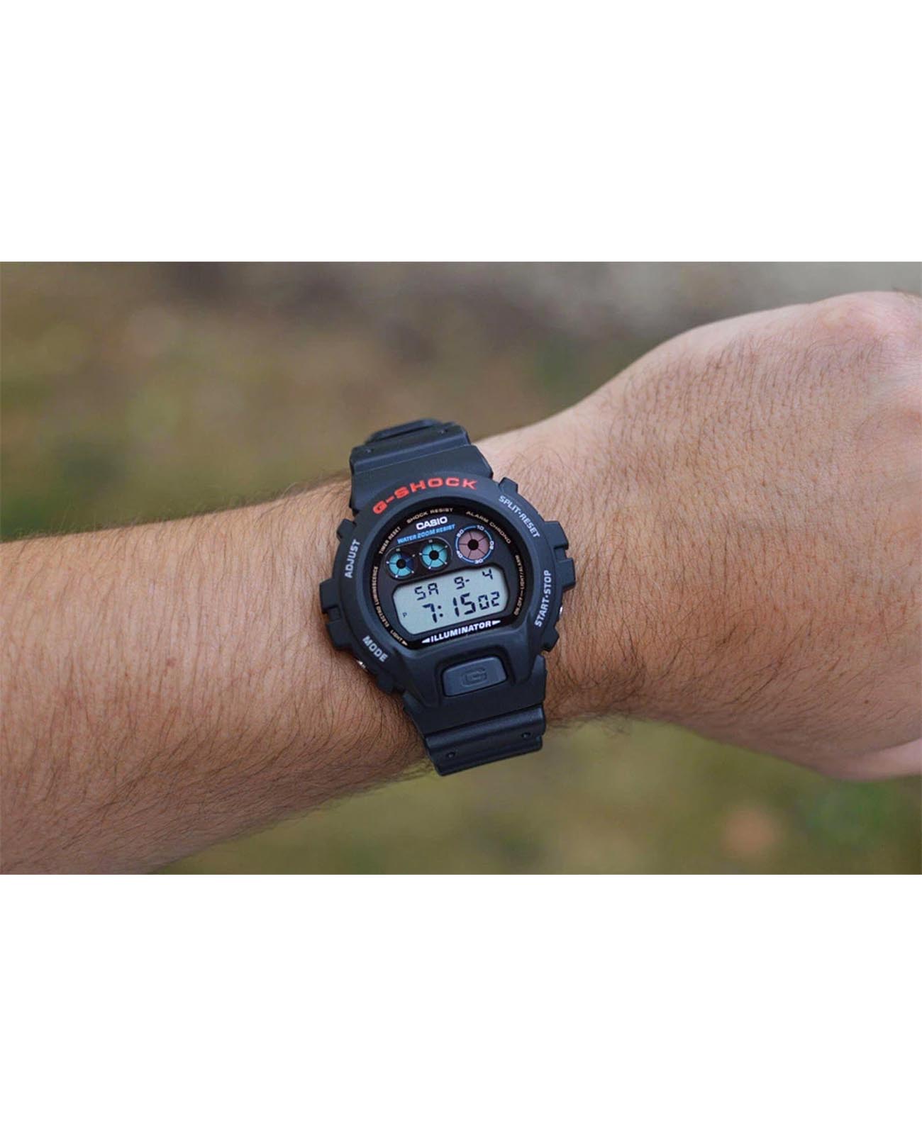 Японские мужские часы Casio G-Shock DW-6900U-1DR. В дизайне модели прослеживается визуальная эстетика 90-х годов, что добавляет ей особого шарма в глазах тех, кто помнит первые кассетные плееры SONY и двухкассетники SHARP. Ударопрочный корпусУдаропрочный корпусМеханизм заключён в корпус, выполненный из современных материалов, устойчивых к ударам, механическим повреждениям и падению с высоты: инновационный пластик, карбон, нержавеющая сталь, титан. из полимерного материала защищает механизм от ударов и вибрации. Минеральное стеклоМинеральное стеклоМинеральное стекло представляет собой искусственно выращенный минерал кварца. Такое стекло отличается особой устойчивостью к повреждениям и царапинам. Уступает по некоторым качествам сапфировому стеклу. устойчивое к появлению царапин, обладающее высокой прозрачностью. Светодиодная подсветкаСветодиодная подсветкаСветодиодная или LED-подсветка обеспечивает появление яркого холодного свечения за счёт LED-элементов - маленьких лампочек. Они потребляют минимальное количество энергии, чаще всего можно встретить 1 светодиод, в нижней части циферблата., послесвечение. 12/24-часовой формат. вечный календарьВечный календарьКлассическое часовое усложнение, представляющее собой календарь, рассчитанный на несколько лет вперёд (стандартно – до 2099 года). Определяет текущую дату, день недели, месяц.. СекундомерСекундомерСекундоме́р — прибор, способный измерять интервалы времени с точностью до долей секунды.. ТаймерТаймерОтсчитывает секунды в обратном направлении в заданном интервале времени.. Часовой сигнал времени. Многофункциональный будильник. Класс водозащиты: 200 метров, позволит плавать, нырять и заниматься другими водными видами спорта. Ремешок из полимерного материала на стандартной застежке.