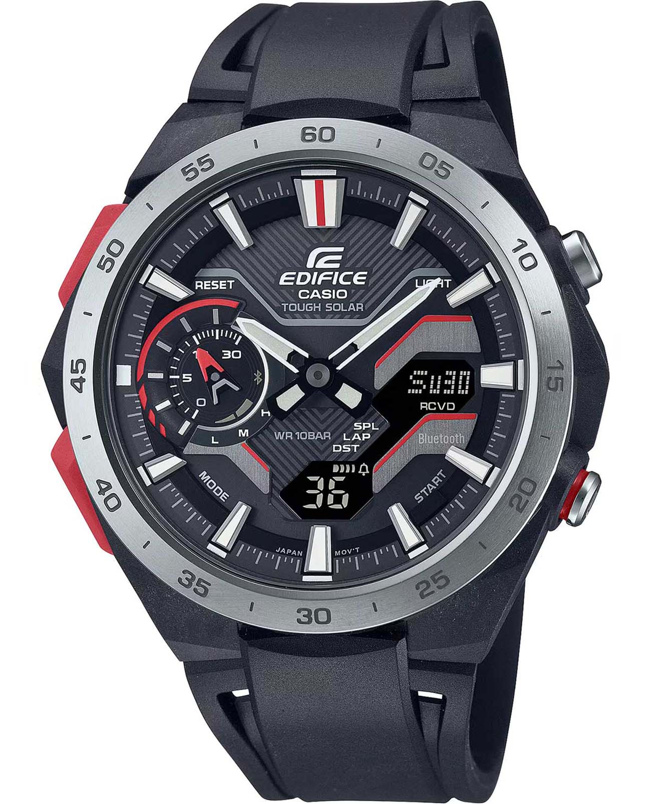 Мужские часы, дизайн которых вдохновлен воздушным потоком вокруг гоночного автомобиля. Многофункциональные японские мужские часы с BluetoothBluetoothСовременная технология, позволяющая синхронизировать часы с телефоном и переносить данные. Часы с Bluetooth расширяют возможности вашего смартфона и делают его использование ещё более удобным. Casio Edifice Windflow ECB-2200P-1AEF, кварцевый механизм с высокой точностью. Класс водозащиты: 100 метров, позволит плавать, нырять и заниматься другими водными видами спорта. Корпус часов изготовлен из карбона со стальной вставкой с IP-покрытиемIP-покрытиеМетод ионного напыления. Демонстрирует повышенную устойчивость к истиранию, окислению и химическим веществам. Под воздействием высокого давления и температуры около 1500°C молекулы металла надёжно соединяются с частицами корпуса часов.. Питание от солнечной энергии Tough SolarTough SolarТехнология основана на подзарядке аккумулятора от источника солнечного света, специальная панель улавливает солнечные лучи и преобразует их в энергию для работы часов. Достаточно пары минут нахождения на солнце для функционирования часов в течении суток. - солнечные батарейки большой мощности, индикатор заряда батареи. Функция автоматического сохранения энергии. Время работы аккумулятора без подзарядки приблизительно 7 месяцев, при включенной функции сохранения энергии приблизительно 18 месяцев. Двойная подcветка: циферблат и ЖК-дисплеи подсвечиваются светодиодомСветодиодная подсветкаСветодиодная или LED-подсветка обеспечивает появление яркого холодного свечения за счёт LED-элементов - маленьких лампочек. Они потребляют минимальное количество энергии, чаще всего можно встретить 1 светодиод, в нижней части циферблата., благодаря наличию функции задержки, после отпускания кнопки освещение горит еще несколько секунд. Настраиваемое послесвечение 1,5 или 3сек. Цвет подсветки: белый. Подсветка NeobriteПодсветка NeobriteИспользование светонакопительных составов на основе сульфида цинка или алюмината стронция, яркий свет можно наблюдать на протяжении 6-10 часов после «зарядки» часов около источника света. обеспечивает длительное послесвечение в темноте даже после кратковременного нахождения на свету. 12-ти и 24-х часовой формат времени. СекундомерСекундомерСекундоме́р — прибор, способный измерять интервалы времени с точностью до долей секунды. с двумя точностями показаний: 1/100с (до 1ч) и 1с (после 1ч) и временем измерения 24ч. Сплит-хронографСплит-хронографИспользуется для измерения продолжительности нескольких временных отрезков, начинающихся одновременно, а заканчивающихся в разное время.. ТаймерТаймерОтсчитывает секунды в обратном направлении в заданном интервале времени. обратного отсчета от 1с до 1ч. Мировое времяМировое время Полезное часовое усложнение, отображающее время в основных городах и известных областях по всему миру, оно связано с часовыми поясами, удобно для путешественников и бизнесменов. – 38 городов (38 часовых поясов), всемирное координированное время (UTCUTCВсемирное кординационное время, не имеющее привязки к географическому положению Гринвича, основывается на атомном отсчёте времени. Регулировка времени осуществляется более точно, чем устаревшее GMT.