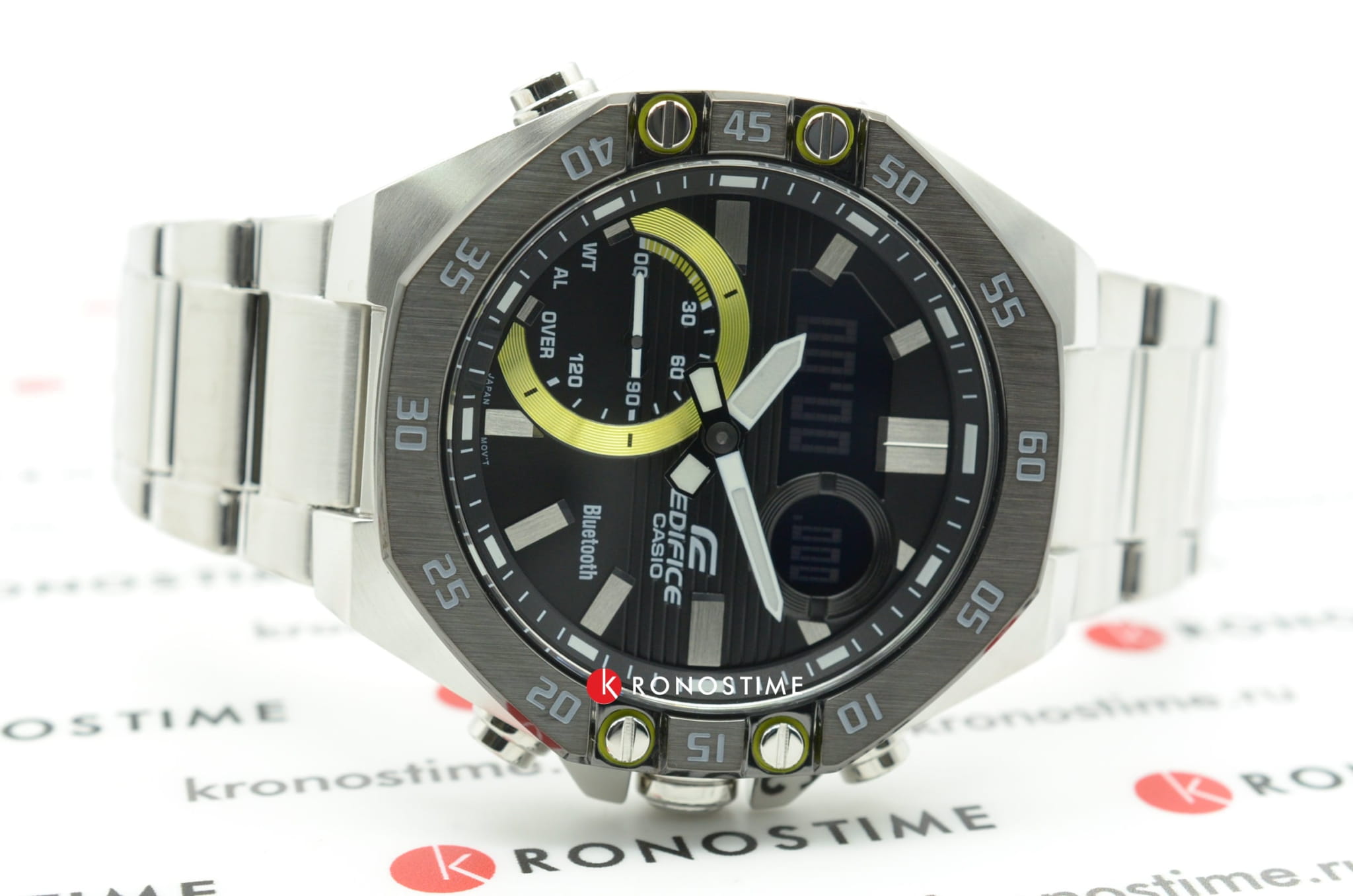 Casio Edifice ECB-10DB-1A – мужские часы, сочетающие спортивный дизайн и современные технологии. Корпус размером 51×48,5 мм и толщиной 12,5 мм выполнен из нержавеющей стали, обеспечивая прочность и устойчивость к коррозии. Чёрный циферблат с аналогово-цифровым отображением времени защищён минеральным стекломМинеральное стеклоМинеральное стекло представляет собой искусственно выращенный минерал кварца. Такое стекло отличается особой устойчивостью к повреждениям и царапинам. Уступает по некоторым качествам сапфировому стеклу., устойчивым к царапинам.