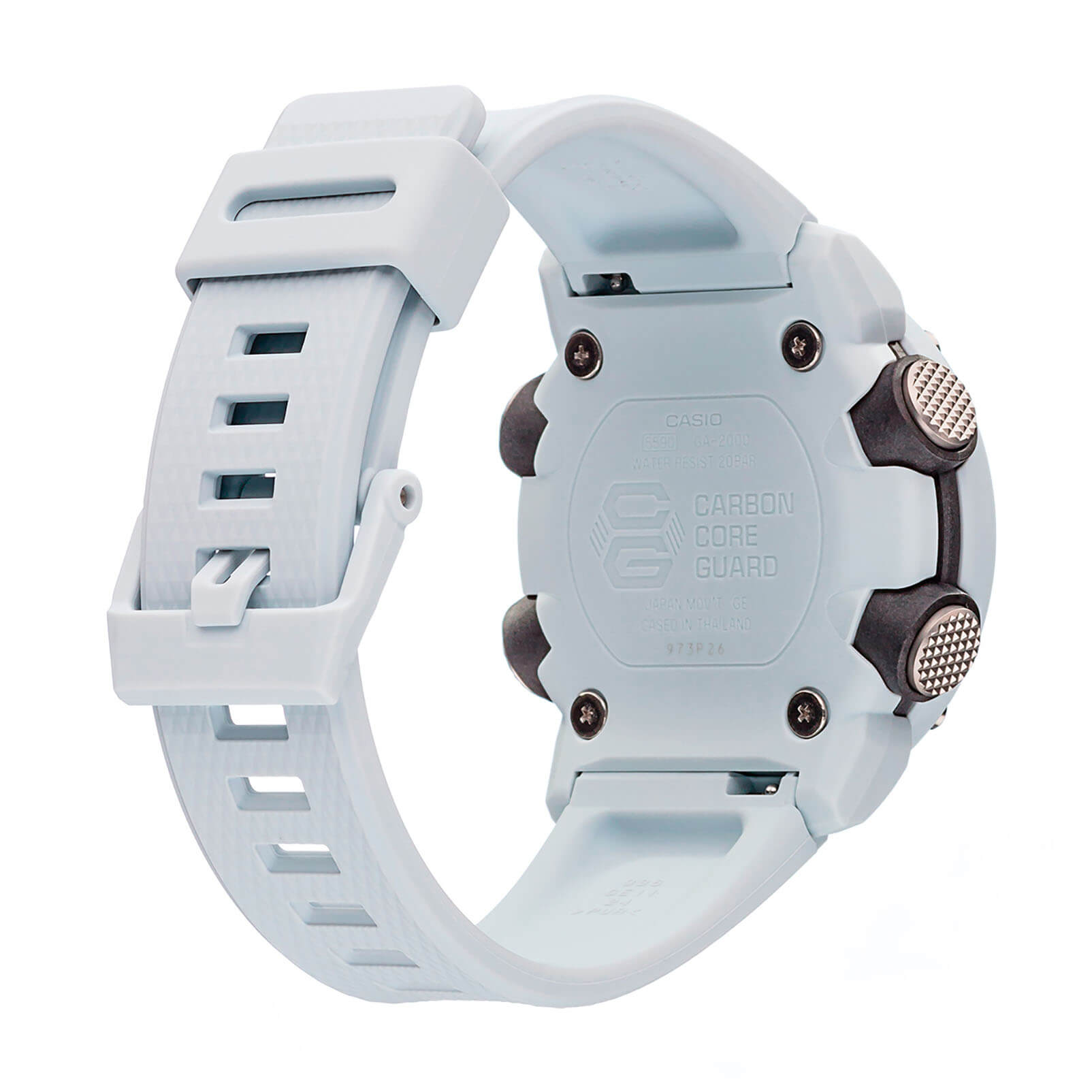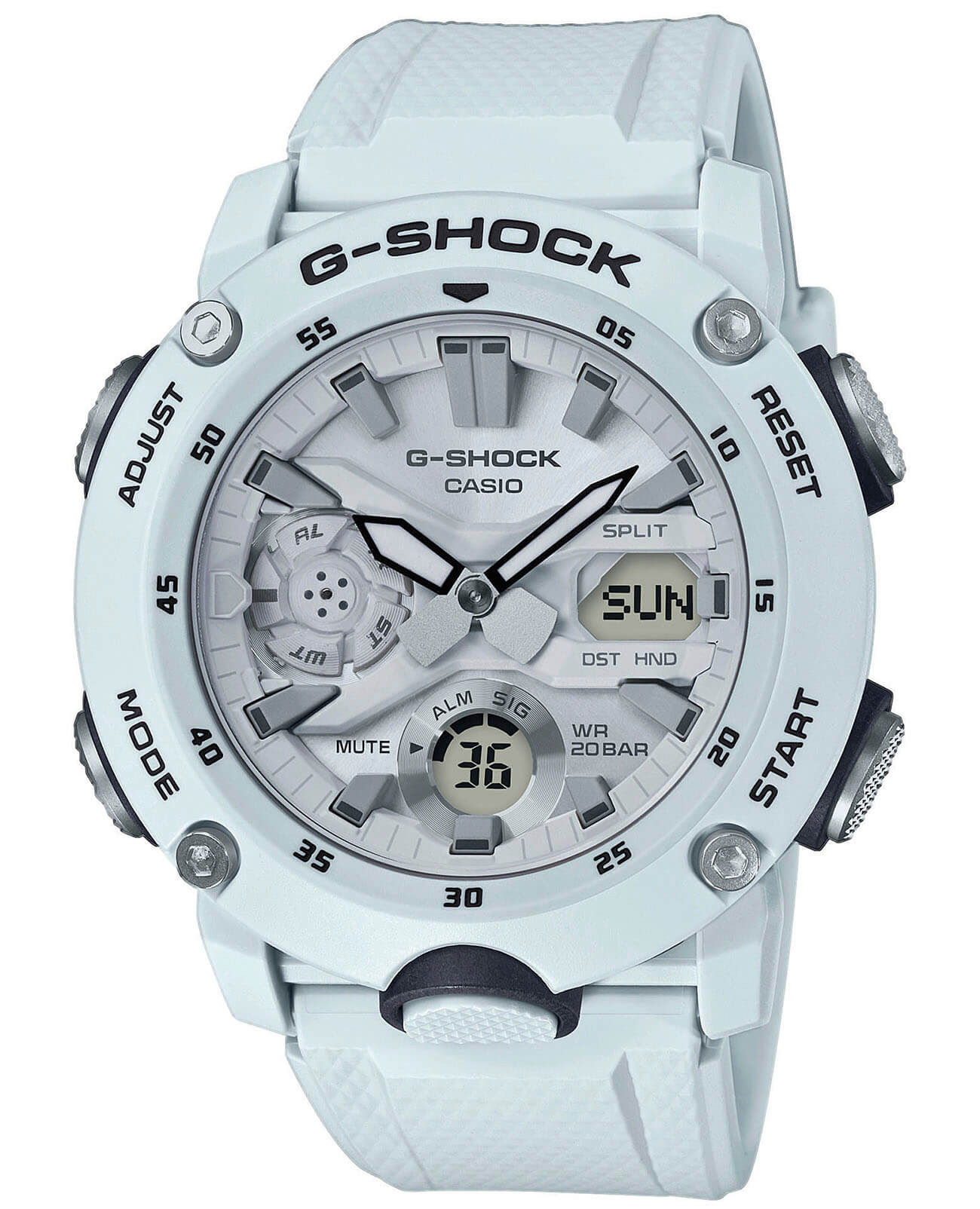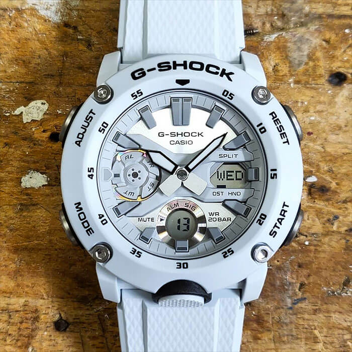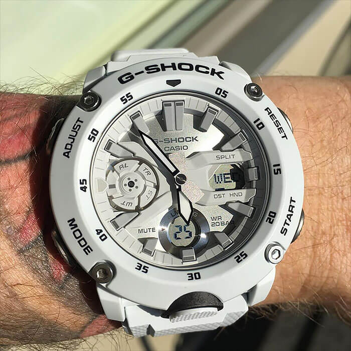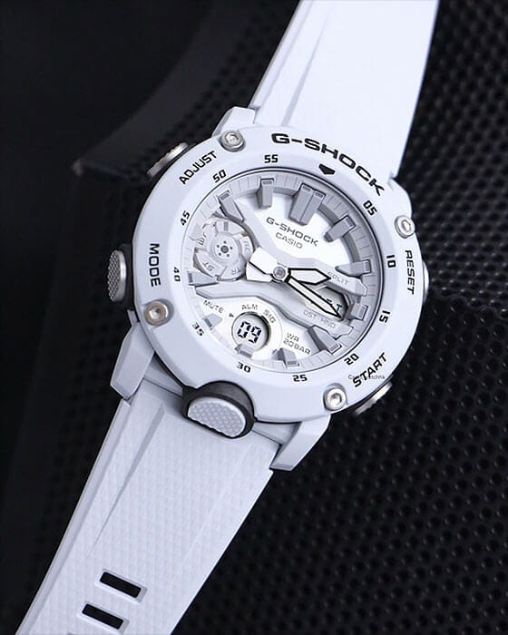 Наручные часы в белоснежном исполнении реализуют технологию Carbon Core GuardCarbon Core Guard Новейшая структура корпуса, разработанная Casio. Полиуретановая пластина дополнительно усилена карбоновыми вставками, что придаёт специальную защиту от механических повреждений. Карбон отличается лёгкостью и прочностью., карбон послужил материалом для изготовления противоударного корпусаУдаропрочный корпусМеханизм заключён в корпус, выполненный из современных материалов, устойчивых к ударам, механическим повреждениям и падению с высоты: инновационный пластик, карбон, нержавеющая сталь, титан.. Это позволило добиться повышенной устойчивости к ударам и падению без утяжеления общей конструкции. БезельБезельВнешний ободок, закрепляющий стекло. В спортивных часах так называется поворотное кольцо с делениями на циферблате, выполняет роль таймера – замеряет отрезки времени на шкале. Неподвижный безель – элемент декора. Однонаправленно вращающийся безель на дайверских часах позволяет фиксировать моменты погружения и выныривания на поверхность. оставлен полимерным. Японский кварцевый механизм работает за счёт батарейки, срок службы которой - 3 года. Закаленное минеральное стекло. Двойная задняя крышка, стальная и пластиковая. Светодиодная подсветкаСветодиодная подсветкаСветодиодная или LED-подсветка обеспечивает появление яркого холодного свечения за счёт LED-элементов - маленьких лампочек. Они потребляют минимальное количество энергии, чаще всего можно встретить 1 светодиод, в нижней части циферблата.. Водонепроницаемость 200 метров. Возможность быстрой и лёгкой замены полимерного ремешка. ХронографХронографФункция позволяет измерять отрезки времени с особой точностью: часы, минуты, секунды. Верным признаком хронографа является наличие на циферблате 3 дополнительных окошек-счётчиков., автоматический календарь, мировое времяМировое время Полезное часовое усложнение, отображающее время в основных городах и известных областях по всему миру, оно связано с часовыми поясами, удобно для путешественников и бизнесменов. , будильник, секундомер, таймер с автоповтором. Габариты: 48,7 x 51,2 x 14,1 мм.