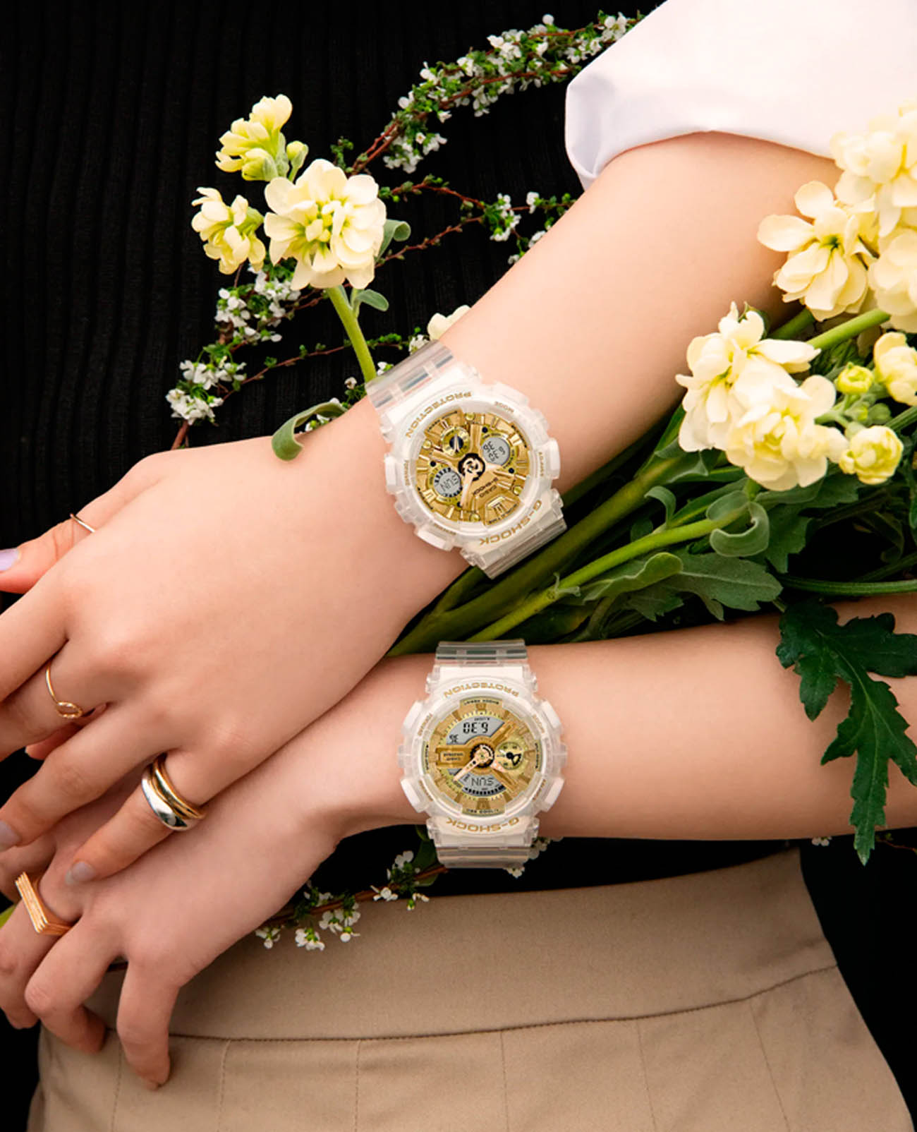 Японские женские часы-хронографХронографФункция позволяет измерять отрезки времени с особой точностью: часы, минуты, секунды. Верным признаком хронографа является наличие на циферблате 3 дополнительных окошек-счётчиков. Casio G-Shock GMA-S110SG-7AER. Стильная и лаконичная фешн-модель в полупрозрачном корпусе из серии G-SHOCK S SERIES с аналого-цифровым циферблатом золотого цвета. Без сомнения, эти яркие и аутентичные джишоки способны приковать к себе внимание и украсить любое, даже самое изящное женское запястье. Минеральное стеклоМинеральное стеклоМинеральное стекло представляет собой искусственно выращенный минерал кварца. Такое стекло отличается особой устойчивостью к повреждениям и царапинам. Уступает по некоторым качествам сапфировому стеклу. устойчивое к появлению царапин, обладающее высокой прозрачностью. Ударопрочный корпусУдаропрочный корпусМеханизм заключён в корпус, выполненный из современных материалов, устойчивых к ударам, механическим повреждениям и падению с высоты: инновационный пластик, карбон, нержавеющая сталь, титан. защищает механизм от ударов и вибрации. Многокомпонентный циферблат состоит из цифровых окошек указателей числа и дня недели, а также индикатора режима работы часов, который расположен в позиции 9 часов и выполнен в виде пропеллера. Светодиодная автоподсветка - при повороте часов в сторону лица подсветка дисплея осуществляется автоматически. Настраиваемое послесвечение 1,5 или 3сек. Мировое времяМировое время Полезное часовое усложнение, отображающее время в основных городах и известных областях по всему миру, оно связано с часовыми поясами, удобно для путешественников и бизнесменов. – 48 городов (29 часовых поясов). СекундомерСекундомерСекундоме́р — прибор, способный измерять интервалы времени с точностью до долей секунды. с точностью измерения 1/100 секунды и измерением до 23 часов 59 минут 59,99 cек. ТаймерТаймерОтсчитывает секунды в обратном направлении в заданном интервале времени. обратного отсчета (диапазон времени 24 часа), автоматический календарь, 12/24 отображение времени. 5 будильниковБудильникБуди́льник — часы, в заданный момент времени подающие звуковой, световой и/или в редких случаях другой сигнал., один с функцией Snooze, ежечасный сигнал. Класс водозащиты: 200 метров, позволит плавать, нырять и заниматься другими водными видами спорта. Ремешок из полимерного материала на стандартной застежке.