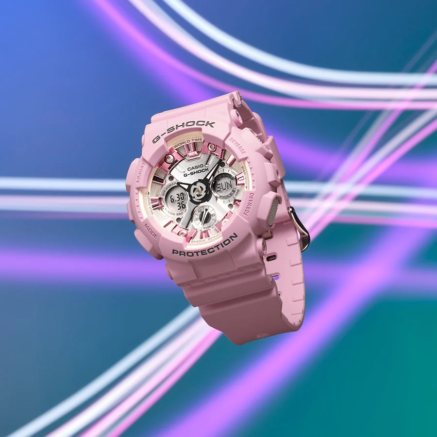 Японские женские часы GMA-S120NP-4A из коллекции G-Shock представлены в спортивном облачении. Кварцевые часы. Аналогово-цифровой циферблат. Наручные часы с противоударным корпусомУдаропрочный корпусМеханизм заключён в корпус, выполненный из современных материалов, устойчивых к ударам, механическим повреждениям и падению с высоты: инновационный пластик, карбон, нержавеющая сталь, титан. выполнены из полимерного материала, легко поглощающего силу удара и вибрации, что делает их надёжным и долговечным аксессуаром. Кварцевый механизм японского производства. Батарейка рассчитана на 3 года службы. Стрелки со светодиодной подсветкойСветодиодная подсветкаСветодиодная или LED-подсветка обеспечивает появление яркого холодного свечения за счёт LED-элементов - маленьких лампочек. Они потребляют минимальное количество энергии, чаще всего можно встретить 1 светодиод, в нижней части циферблата.. Минеральное стеклоМинеральное стеклоМинеральное стекло представляет собой искусственно выращенный минерал кварца. Такое стекло отличается особой устойчивостью к повреждениям и царапинам. Уступает по некоторым качествам сапфировому стеклу.. Защита от магнитных полей. Водонепроницаемость 200 метров, позволит плавать, нырять и заниматься другими водными видами спорта. Функциональные возможности: мировое времяМировое время Полезное часовое усложнение, отображающее время в основных городах и известных областях по всему миру, оно связано с часовыми поясами, удобно для путешественников и бизнесменов. , таймерТаймерОтсчитывает секунды в обратном направлении в заданном интервале времени. обратного отсчёта, будильникБудильникБуди́льник — часы, в заданный момент времени подающие звуковой, световой и/или в редких случаях другой сигнал., хронографХронографФункция позволяет измерять отрезки времени с особой точностью: часы, минуты, секунды. Верным признаком хронографа является наличие на циферблате 3 дополнительных окошек-счётчиков., автоматический календарь до 2099 года, UTCUTCВсемирное кординационное время, не имеющее привязки к географическому положению Гринвича, основывается на атомном отсчёте времени. Регулировка времени осуществляется более точно, чем устаревшее GMT.